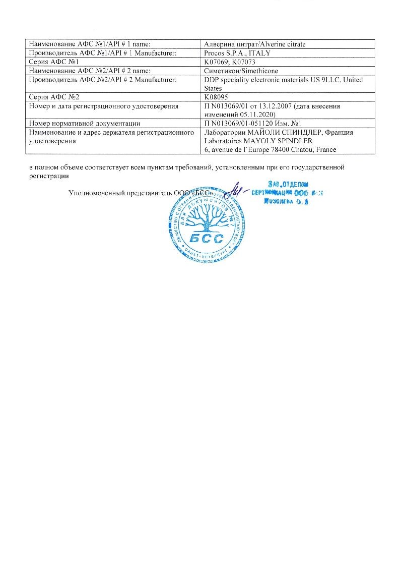 Для формирования активного состава производитель воспользовался симетиконом и альверина цитратом из клинико-фармакологических групп пеногасителей и спазмолитиков. Вспомогательный состав представлен такими ингредиентами: