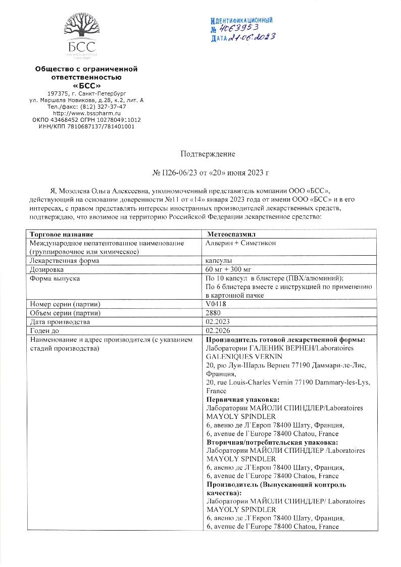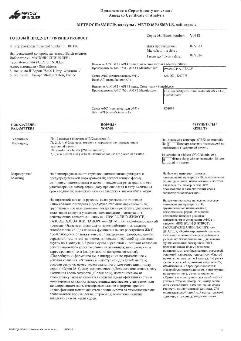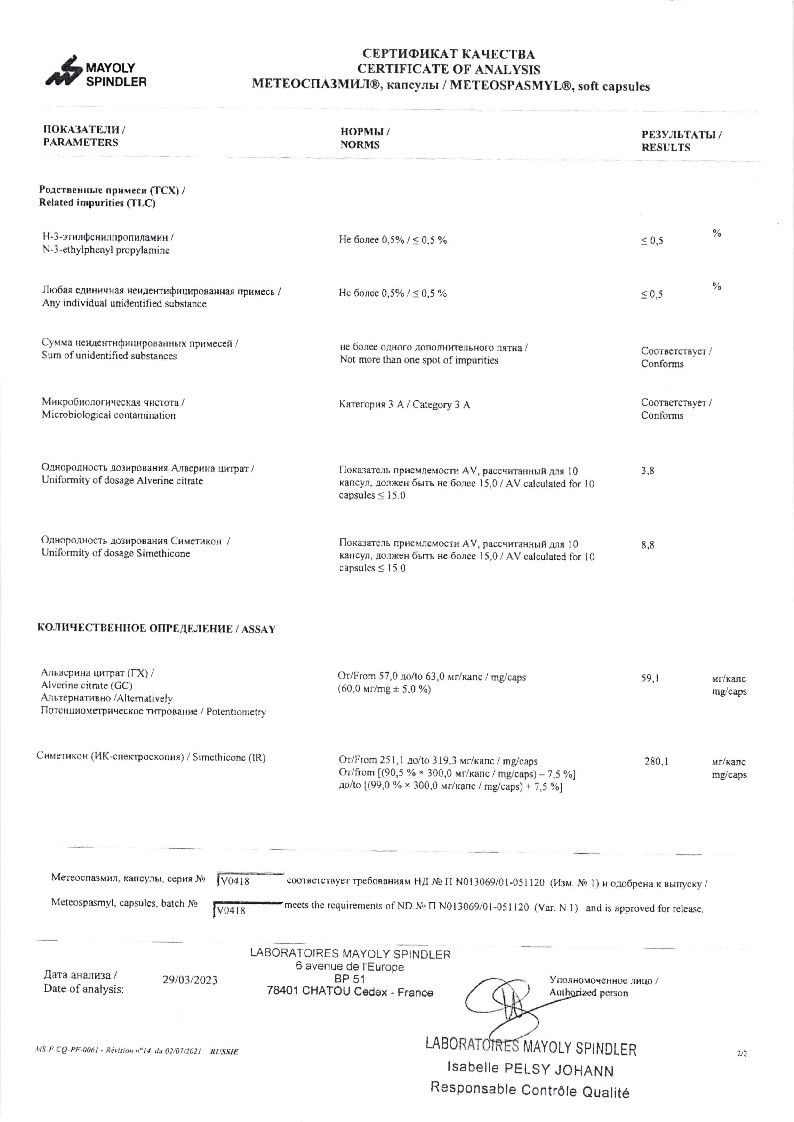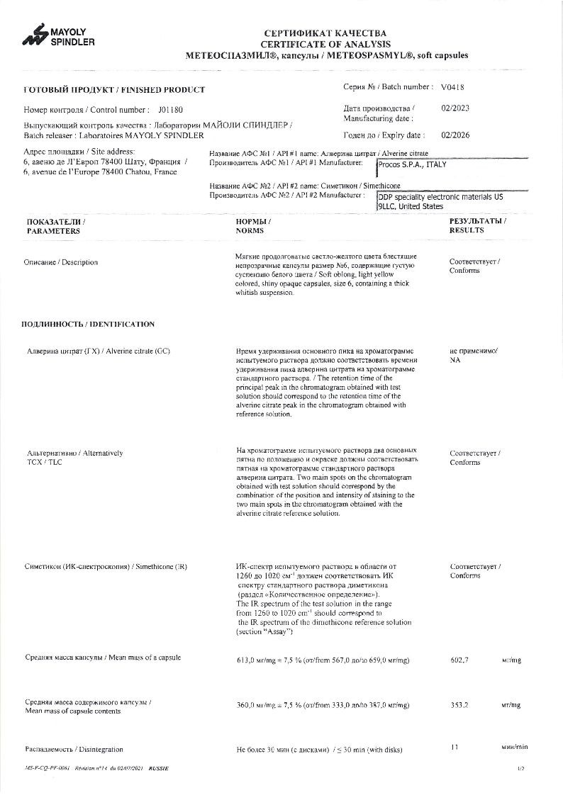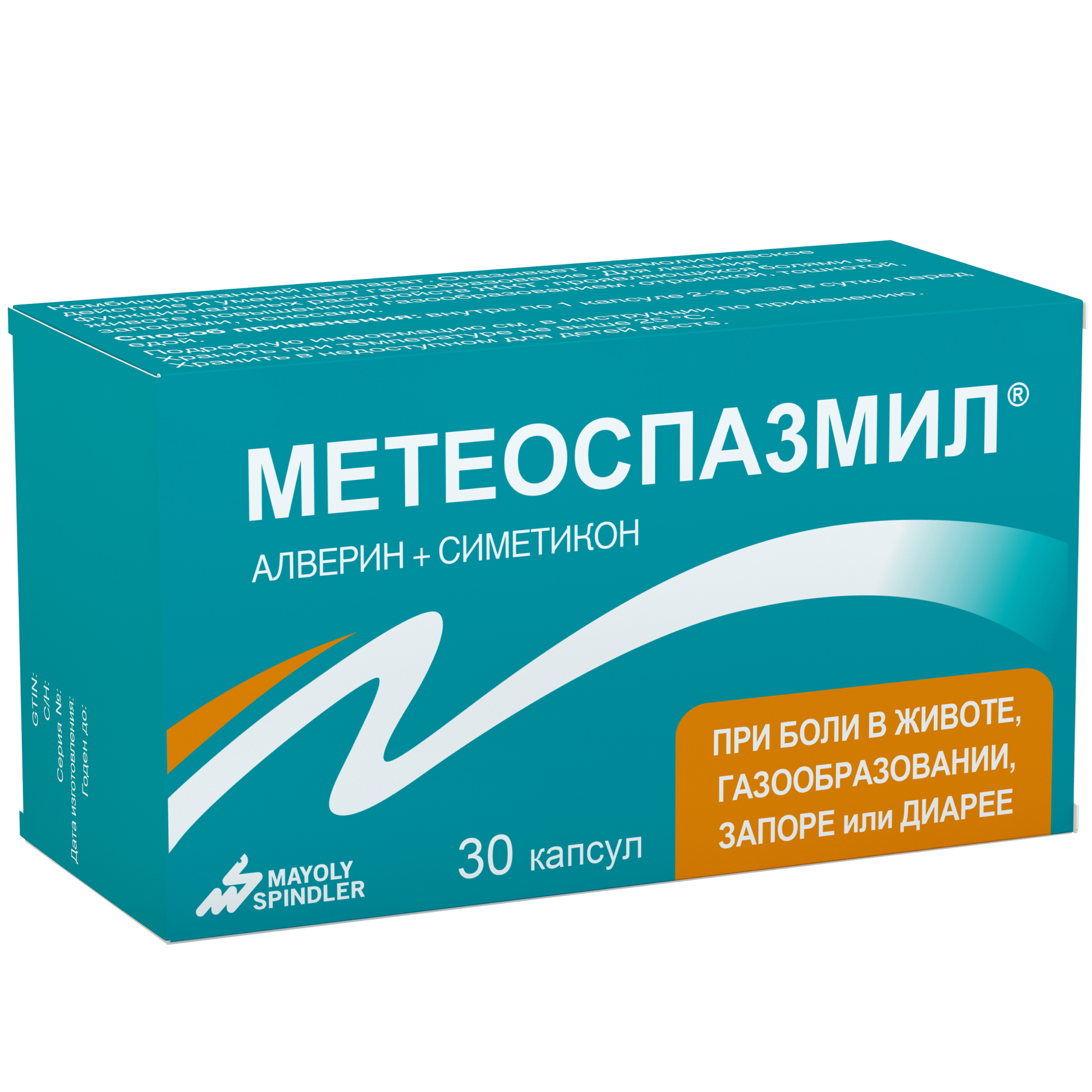 Метеоспазмил производится французской фармацевтической компанией Майоли Спиндлер Лаборатория. Препарат выпускается в форме кишечнорастворимых капсул, внутри которых находится белая суспензия без какого-либо запаха. Расфасованы они в контурные ячейки блистеров, вложенных в картонную коробку вместе с подробной инструкцией по применению.