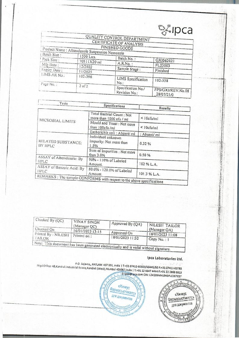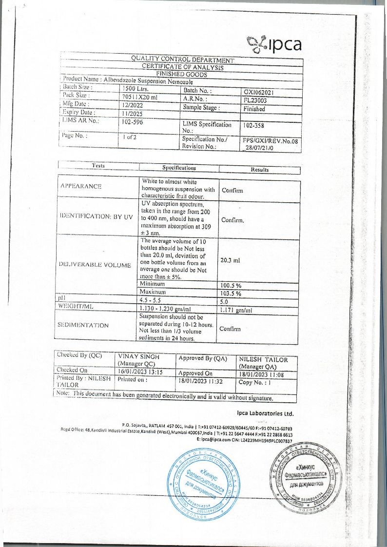 Претерпевает биотрансформацию в печени, превращаясь в первичный метаболит. Максимальная концентрация в крови достигается через 2-5 часов после приема. До 70% связывается с белками крови. Равномерно распределяется по всему организму. Затем превращается в альбендазола сульфон, который является вторичным метаболитом. Полувыведение составляет от 8 до 12 часов. Выводится из организма в виде различных метаболитов через мочу.
