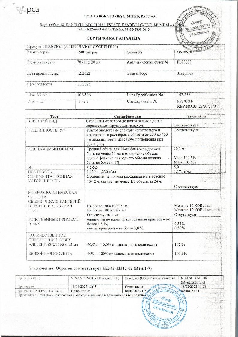 Немозол суспензия д/внутр примен 100мг/5мл фл 20мл