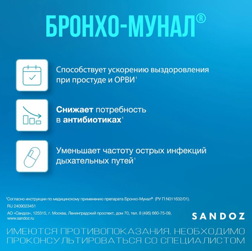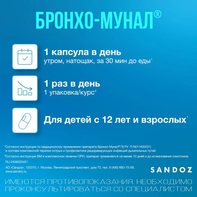 В составе комплексной терапии острых инфекций дыхательных путей препарат применяют до исчезновения симптомов, но не менее 10 дней. При проведении антибиотикотерапии Бронхо-мунал® следует принимать в сочетании с антибиотиками с начала лечения. Последующие 2 месяца возможно профилактическое применение препарата: курсами по 10 дней, интервал между курсами 20 дней.