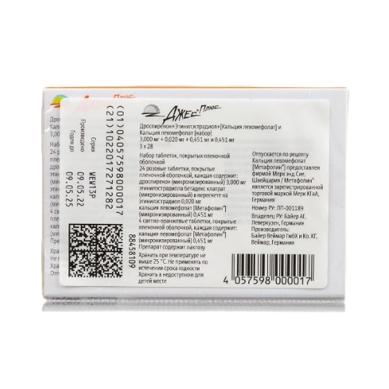 Джес® Плюс - низкодозированный монофазный комбинированный эстроген-гестагенный контрацептивный препарат, состоящий из таблеток, содержащих гормоны и кальция левомефолат, и вспомогательных таблеток, содержащих только кальция левомефолат.