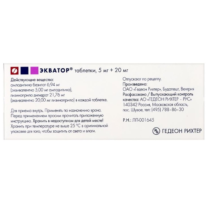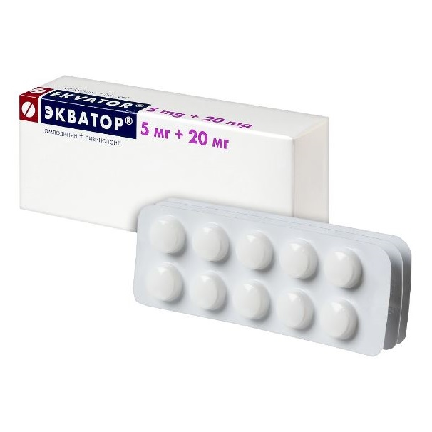 для препарата Экватор® таблетки 5 мг + 20 мг - 5 мг амлодипина и 20 мг лизиноприла,