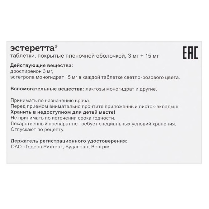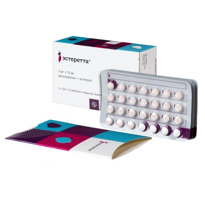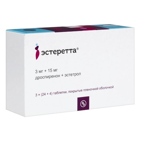 Каждая блистерная упаковка препарата Эстеретта® содержит 28 таблеток: 24 светлорозовые таблетки с гормонами (номера 1-24), и 4 белые таблетки плацебо, не содержащие