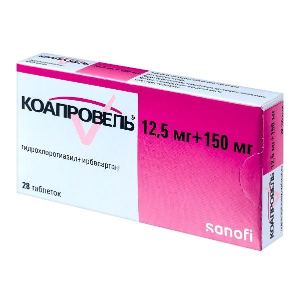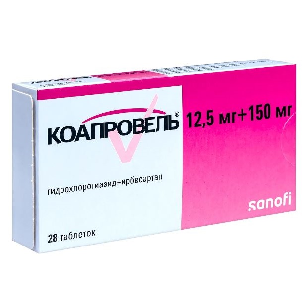 Коапровель® 150 мг/12.5 мг (таблетки, содержащие ирбесартан/гидрохлоротиазид 150 мг/12.5 мг соответственно) можно назначать пациентам, у которых АД недостаточно контролируется гидрохлоротиазидом (12.5 мг/сут) или ирбесартаном (150 мг/сут) в монотерапии.