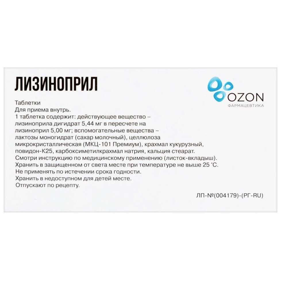 Действующее вещество: лизиноприла дигидрат - 5,44 мг, в пересчете на лизиноприл 5,00 мг.