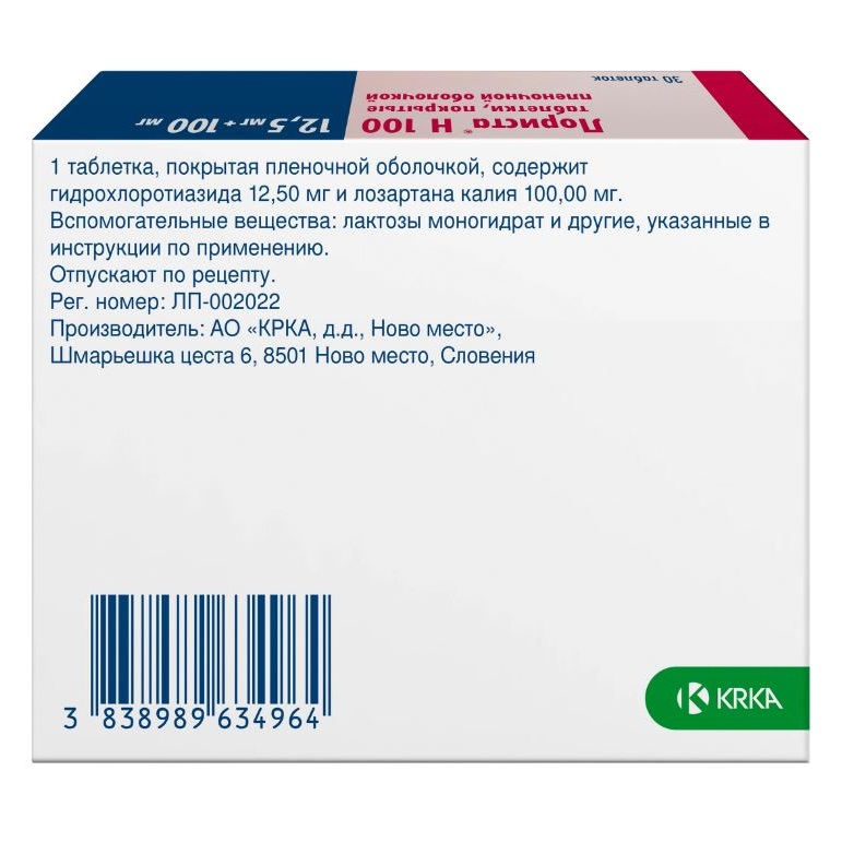 Активные вещества: лозартан калия 100 мг, гидрохлоротиазид 12.5 мг.