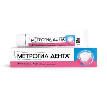 Метрогил Дента® гель для десен стоматологический 20г №1 Метрогил Дента® – стоматологический гель для лечения и профилактики инфекционно-воспалительных заболеваний десен и полости рта. Метрогил Дента® - препарат №1 в России для лечения десен по продажам в денежном выражении среди лекарственных препаратов группы "Средства для лечения полости рта" (1). ОСНОВНЫЕ ПРЕИМУЩЕСТВА Лечит кровоточивость и воспаление десен: Метрогил Дента® борется с воспалением и кровоточивостью десен (2).Может способствовать снижению кровоточивости десен уже через 3 дня (2), при этом средний курс лечения препаратом – 7-10 дней. Мощная комбинация антибиотика и антисептика: благодаря комбинации хлоргексидина и метронизадола Метрогил Дента® оказывает антисептическое и антибактериальное действие на широкий спектр микроорганизмов, вызывающих воспаление десен. Широкий спектр показаний: показан при большинстве инфекционно-воспалительных заболеваний полости рта. Глубокое проникновение в пародонтальные карманы: Метрогил Дента® имеет гелевую основу, которая позволяет активным компонентам препарата проникать в пародонтальные карманы. Удобство применения: Метрогил Дента® удобен в применении, не требует дополнительных средств для нанесения. Не требует специальных условий для применения. Подходит для профилактики обострений хронического гингивита и пародонтита: Метрогил Дента® помогает поддерживать здоровье полости рта. ДРУГОЕ Действие геля для десен обусловлено наличием в его составе двух антибактериальных компонентов: 1. Метронидазол активен в отношении анаэробных бактерий, вызывающих заболевания пародонта. 2. Хлоргексидин – антисептическое и противомикробное средство, активен в отношении грамотрицательных и грамположительных анаэробных и аэробных бактерий. Метрогил Дента® является универсальным препаратом для лечения воспалительных заболеваний полости рта, таких как: