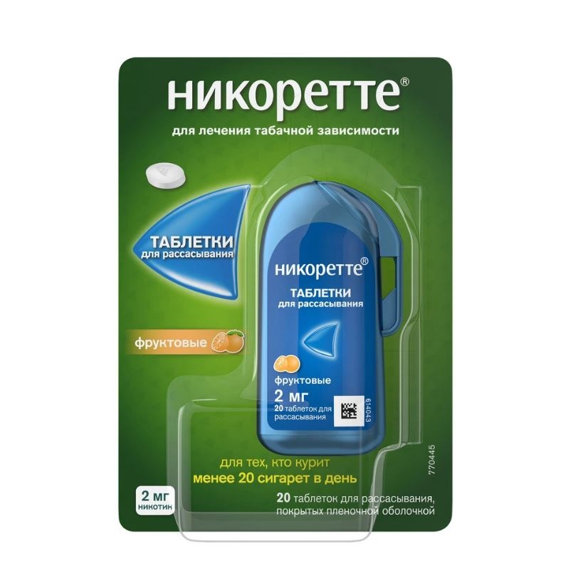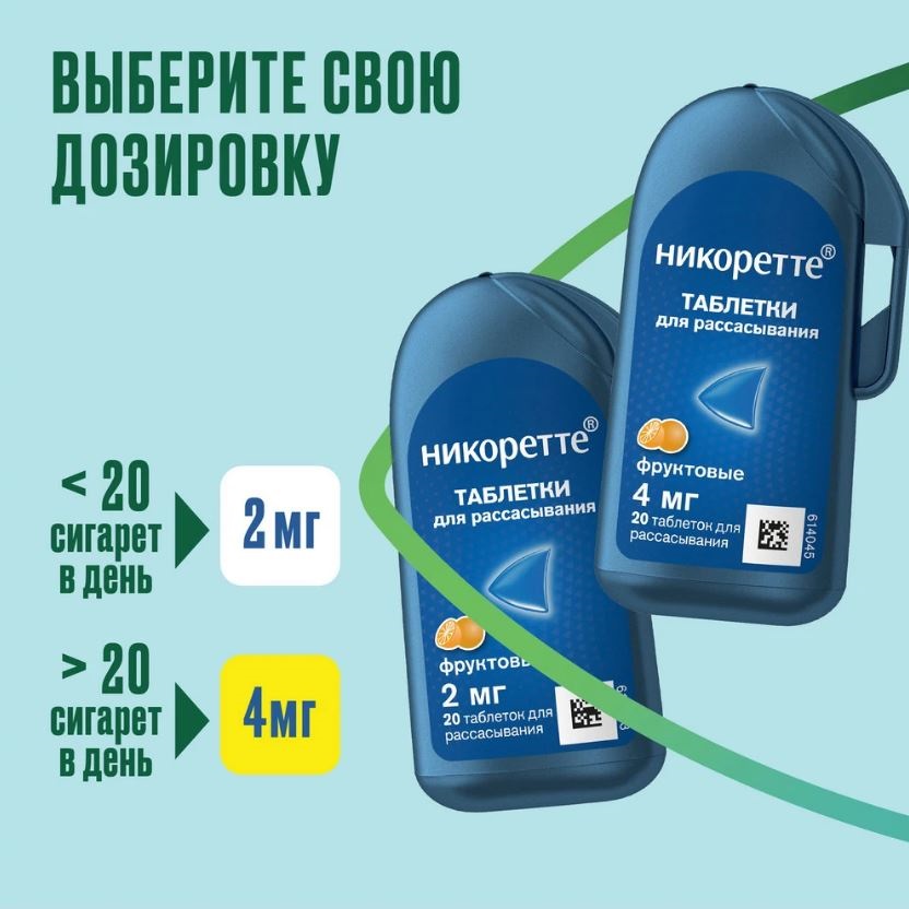 Первоначальная доза подбирается индивидуально, в зависимости от степени никотиновой зависимости пациента. Таблетки для рассасывания Никоретте® с содержанием никотина 4 мг рекомендуется применять тем, кто выкуривает 20 и более сигарет в день или выкуривает первую сигарету через 30 или менее минут после пробуждения. Остальным курильщикам следует начинать лечение с таблеток для рассасывания с содержанием никотина 2 мг.