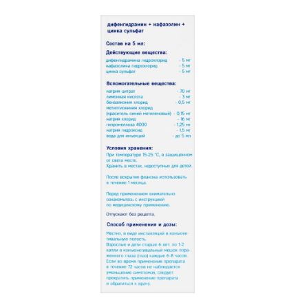 дифенгидрамина гидрохлорид 10 мг, нафазолина гидрохлорид 10 мг, цинка сульфат 10 мг.