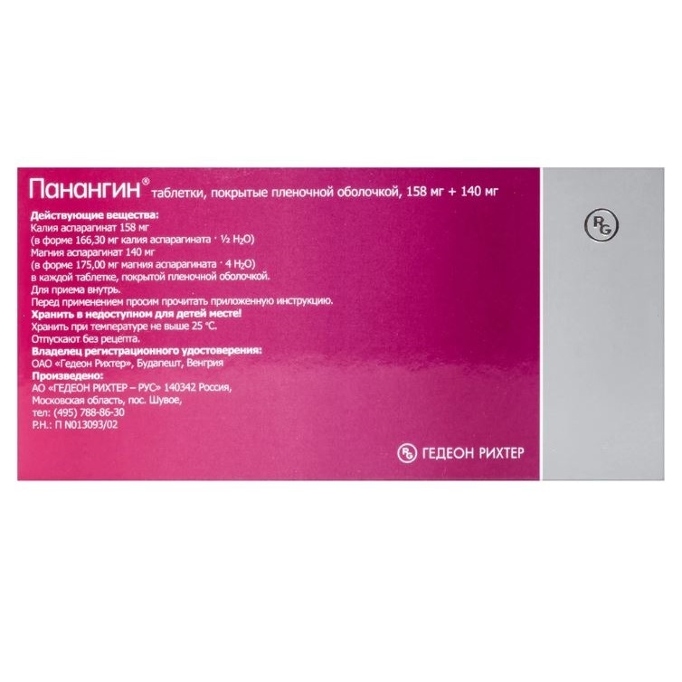 В каждой таблетке, покрытой пленочной оболочкой, препарата Панангин® содержится 36.2 мг калия. Это следует учитывать пациентам с нарушениями функции почек или пациентам, получающим препараты калия или калийсодержащие пищевые добавки.