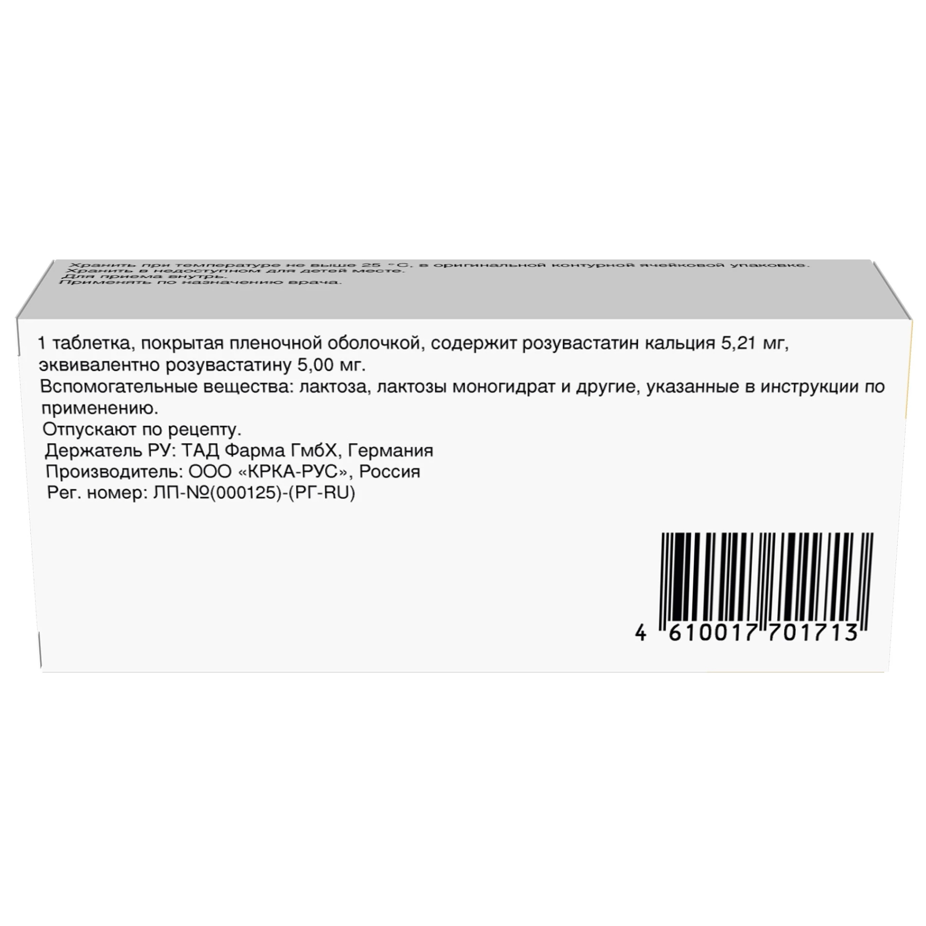 Действующее вещество: розувастатин кальция 5,21 мг эквивалентно розувастатину 5,00 мг;