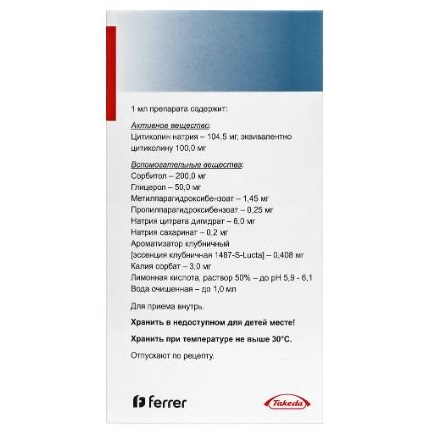 Вспомогательные вещества: сорбитол - 200 мг, глицерол - 50 мг, метилпарагидроксибензоат - 1.45 мг, пропилпарагидроксибензоат - 0.25 мг, натрия цитрата дигидрат - 6 мг, натрия сахаринат - 0.2 мг, ароматизатор клубничный (эссенция клубничная 1487-S-Lucta) - 0.408 мг, калия сорбат - 3 мг, лимонная кислота раствор 50% - до pH 5.9-6.1, вода очищенная - до 1 мл.