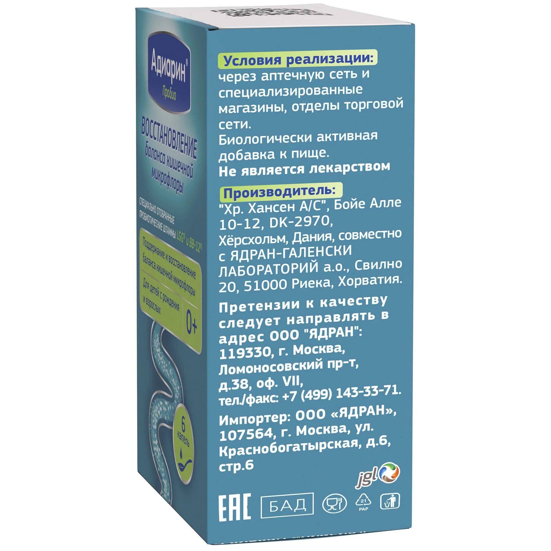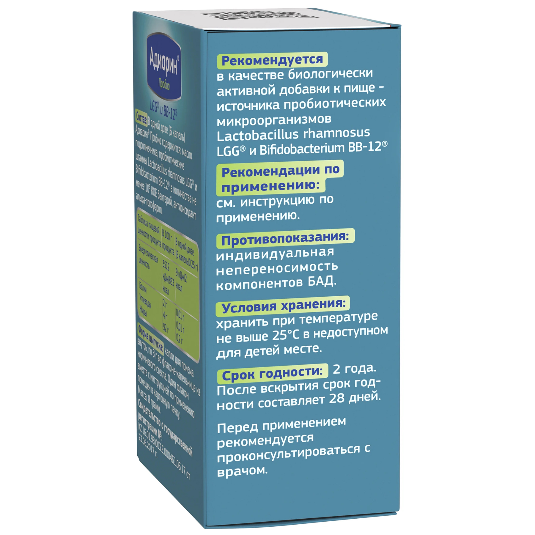 Адиарин Пробио рекомендуется в качестве биологически активной добавки к пище – источника пробиотических микроорганизмов Lactobacillus rhamnosus LGG и Bifidobacterium BB-12: