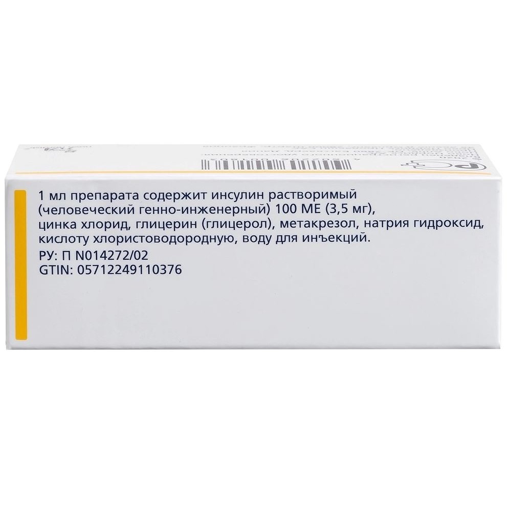 активное вещество: инсулин растворимый (человеческий генно-инженерный) 100 ME (3,5 мг); 1 ME соответствует 0,035 мг безводного человеческого инсулина;