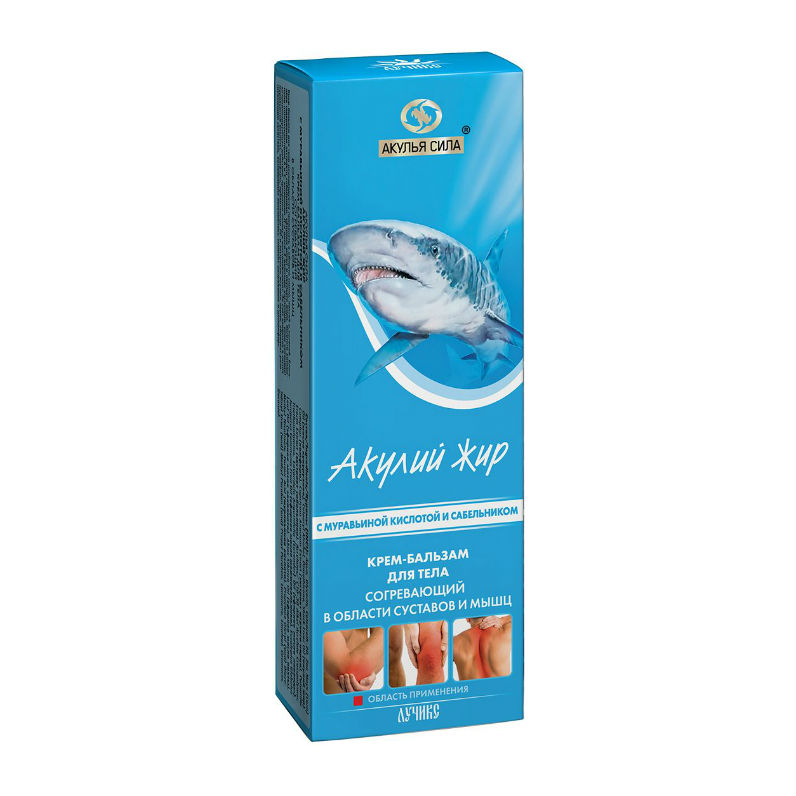 Уникальность и новизна крема-бальзама состоит в том, что в нём впервые были объединены в один препарат три общеизвестных активных природных компонента от суставных и мышечных болей, которые давно и успешно самостоятельно применяются в народной медицине при ревматизме, артритах, остеохандрозе, бурсите, невралгии. Древние японцы считали акулий жир панацеей от всех болезней, рыбаки натирают акульим жиром суставы от ревматизма и артрита, заживляют ожоги и раны. В составе акульего жира содержится большое количество витаминов А, Е, Д. АКУЛИЙ ЖИР обладает противовоспалительным эффектом. САБЕЛЬНИК снимает боль при радикулите, артрите, подагре, болезнях суставов, невралгии, травмах и ушибах, позволяет восстановить нарушенную структуру ткани, убрать очаг воспаления. МУРАВЬИНАЯ КИСЛОТА обладает болеутоляющим, согревающим и противовоспалительным свойствами. Камфора и экстракт перца обладают местноразжижающим и согревающим эффектом, улучшают микроциркуляцию крови, способствуют снятию болевого синдрома и отека в местах воспаления. Витамин Д способствует укреплению костей.