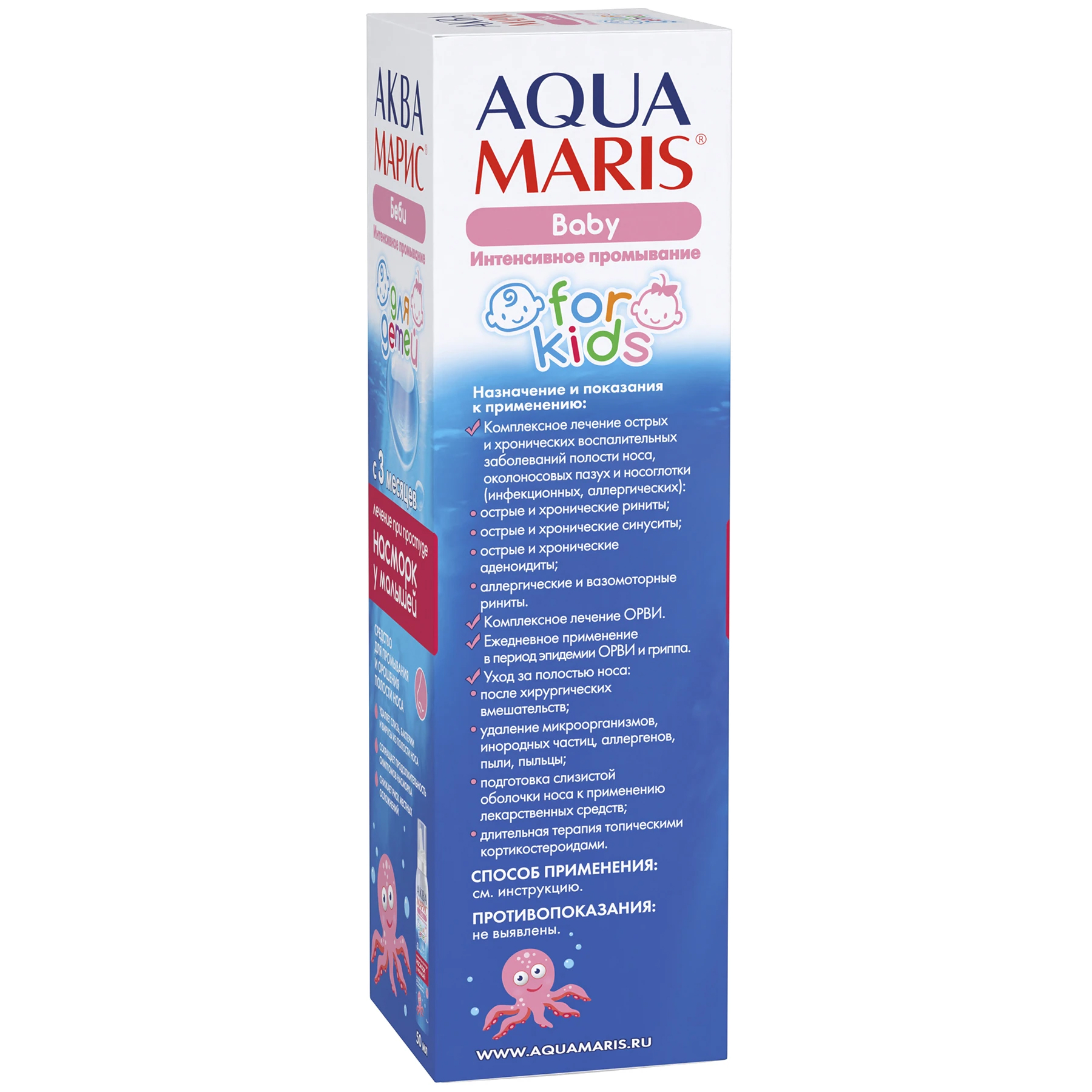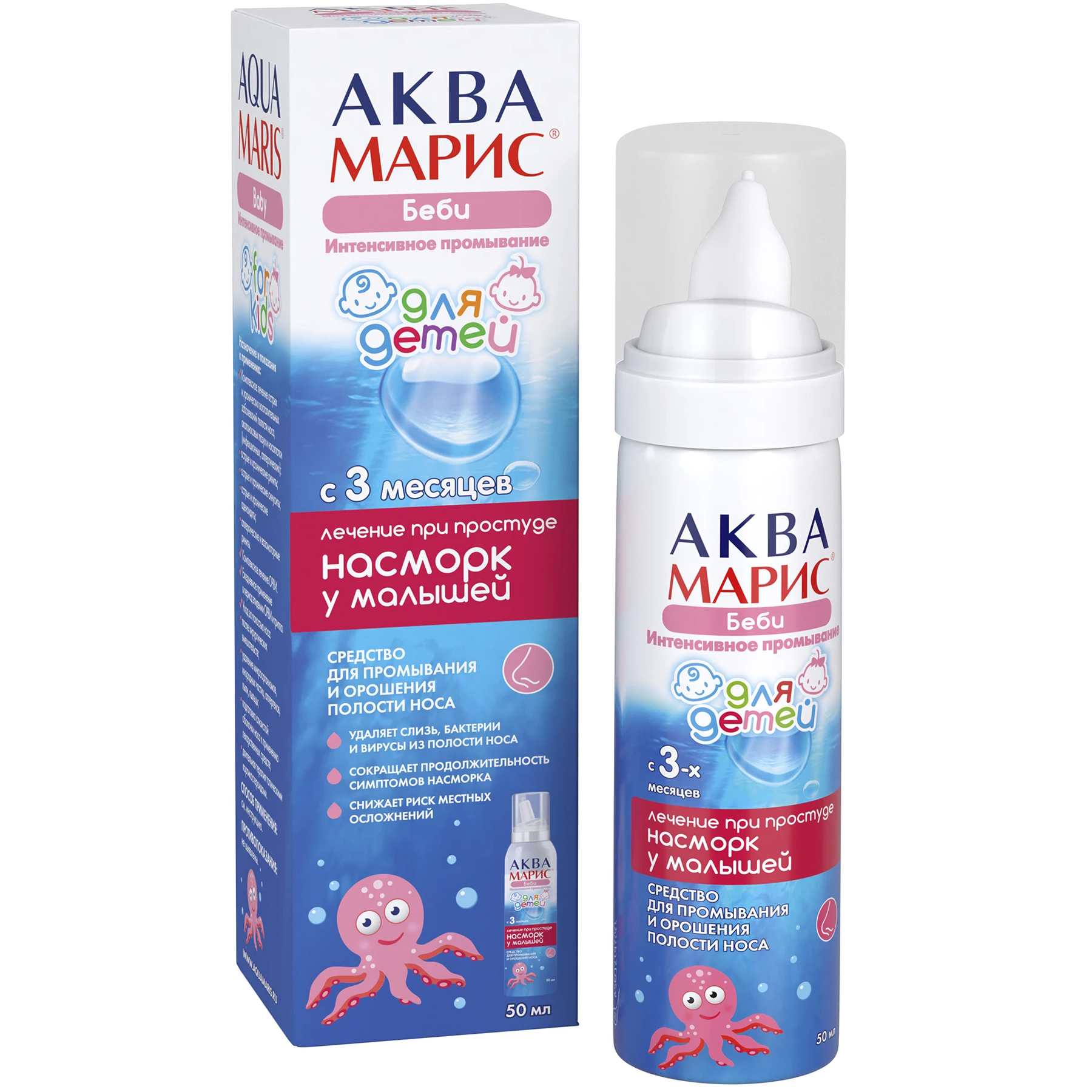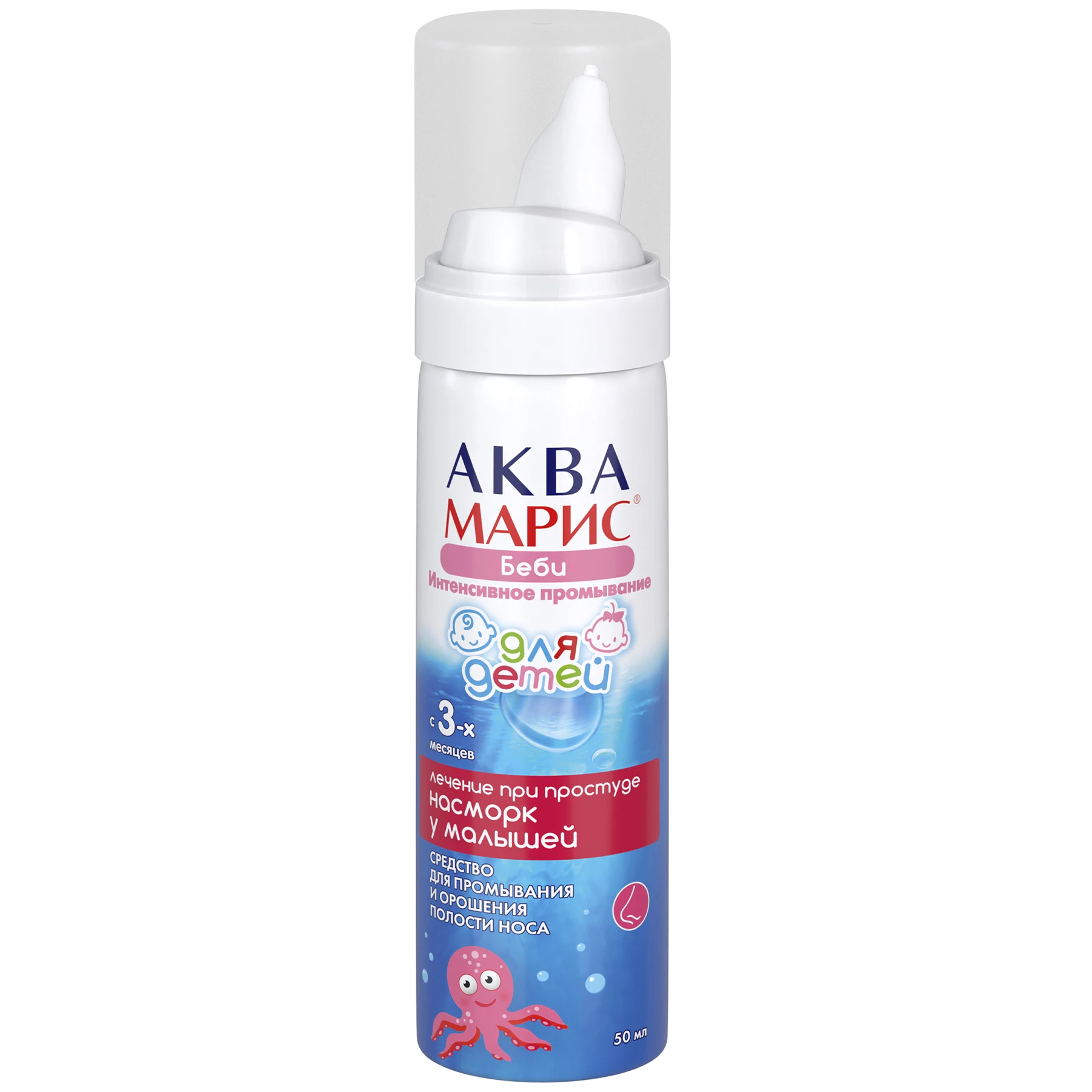 Давление в баллоне средства «Аква Марис® Норм. Интенсивное промывание» достигает значения 8,0∙105 Па, что способствует эффективному промыванию носовых ходов по всей длине. Давление в баллоне «Аква Марис® Беби. Интенсивное промывание» не превышает 7,2·105 Па, обеспечивая деликатное промывание носика малыша с помощью «мягкого душа».