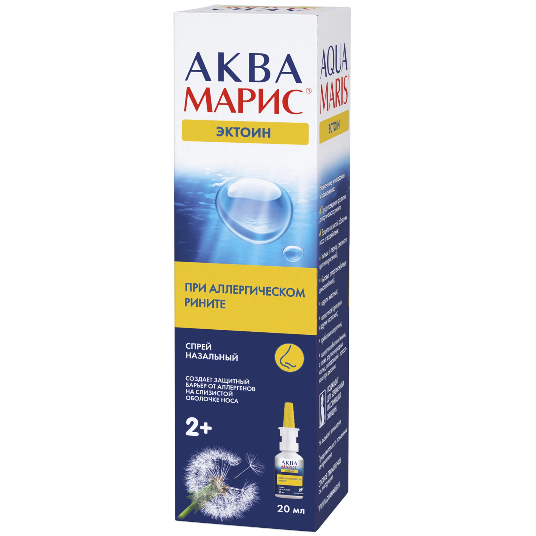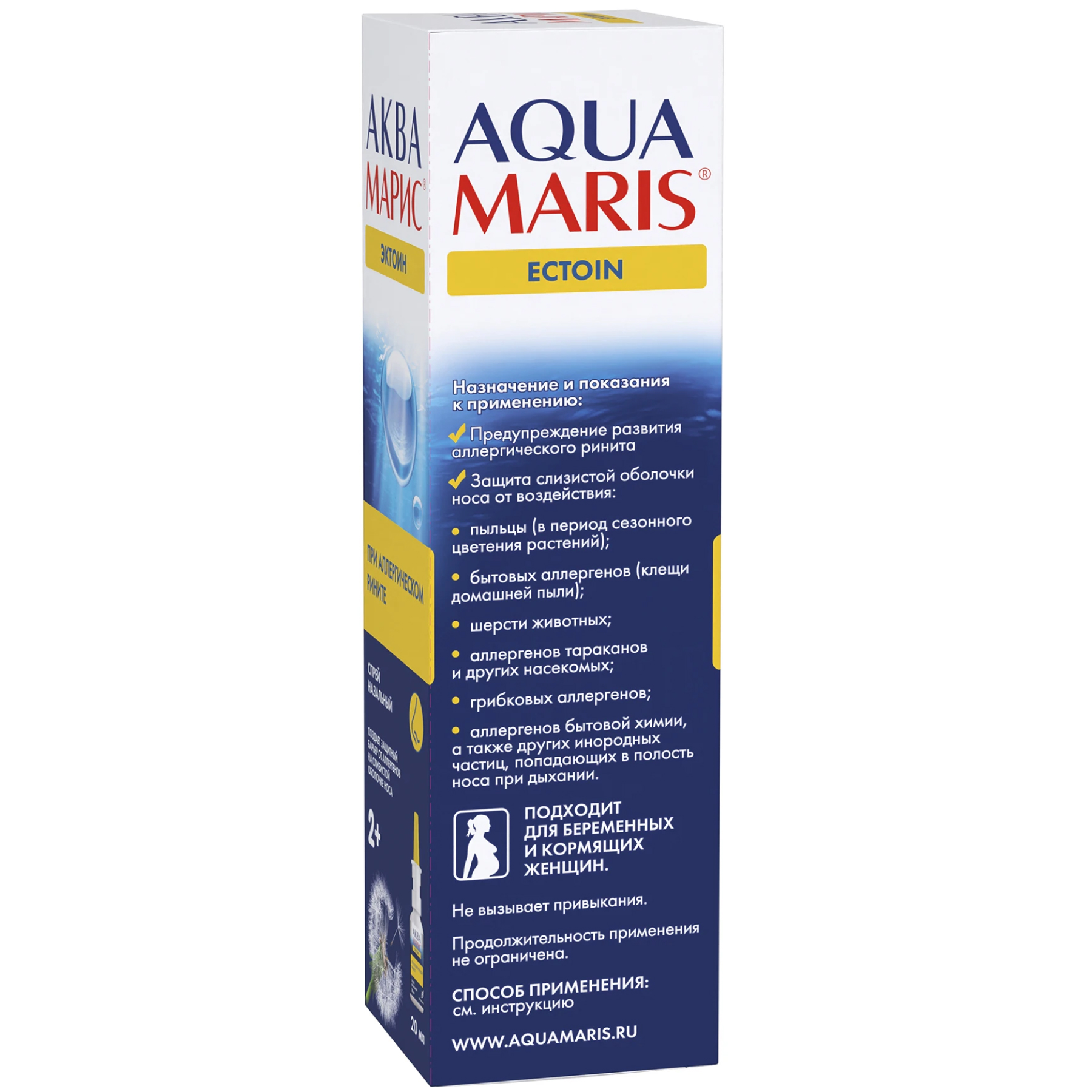 Спрей назальный Аква Марис® Эктоин - это полностью натуральное средство, которое создает физическое препятствие («,барьер»,) для прикрепления аллергенов к слизистой оболочке носа. Аква Марис® Эктоин защищает от развития аллергии, препятствует развитию аллергического ринита и способствует восстановлению слизистой оболочки носа, повреждённой под воздействием аллергенов.