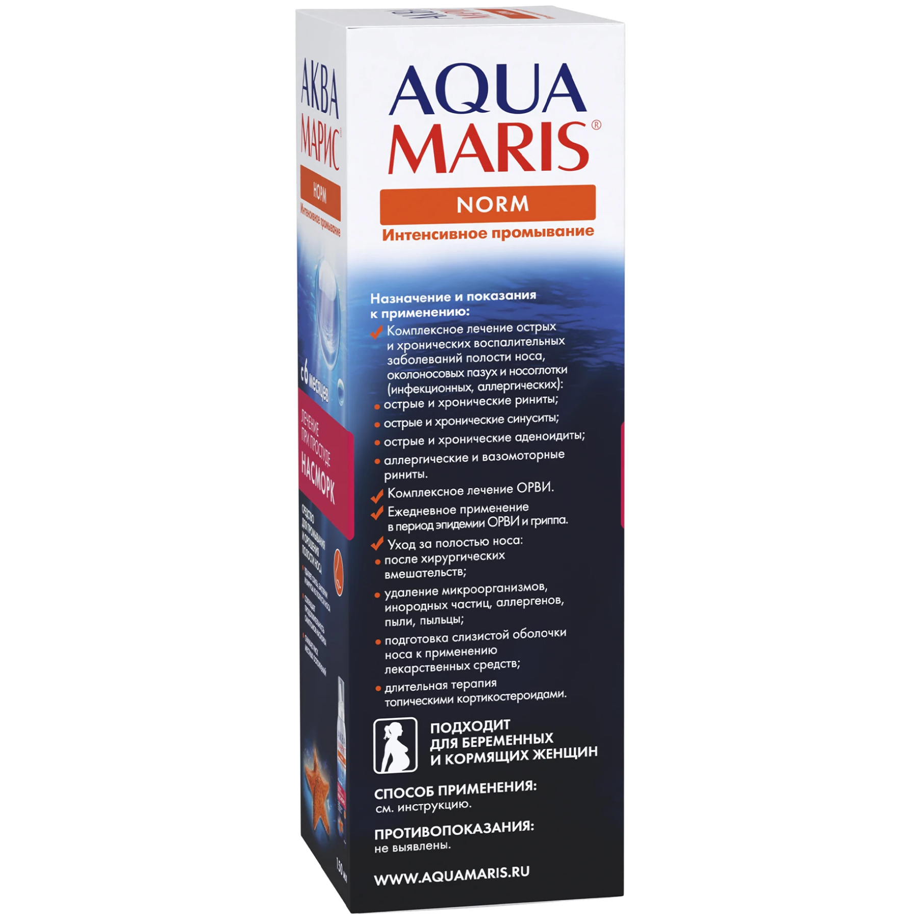 Изотоническая морская вода способствует поддержанию нормального физиологического состояния слизистой оболочки полости носа, способствует разжижению слизи и нормализации ее выработки в бокаловидных клетках слизистой оболочки носовой полости. После применения изделия Аква Марис повышается терапевтическая эффективность лекарственных средств, наносимых на слизистую оболочку носа, и сокращается продолжительность респираторных заболеваний. Изделие для промывания и орошения полости носа «,Аква Марис», снижает риск распространения инфекции в пазухи носа и полость уха (гайморит, фронтит, отит). Снижает риск локальных осложнений и ускоряет процессы заживления после хирургических вмешательств (удаление аденоидов, полипов, септопластика и др.) на носовой полости. Снимает раздражение слизистой носа у лиц, слизистая оболочка верхних дыхательных путей которых постоянно подвергается вредным воздействиям (курильщики, водители автотранспорта, люди, живущие и работающие в помещениях с кондиционированным воздухом и/или центральным отоплением, работающие в горячих и запыленных цехах, а также находящиеся в регионах с суровыми климатическими условиями).