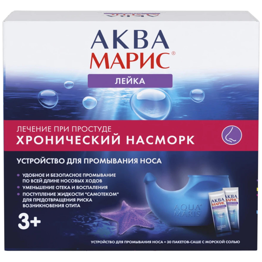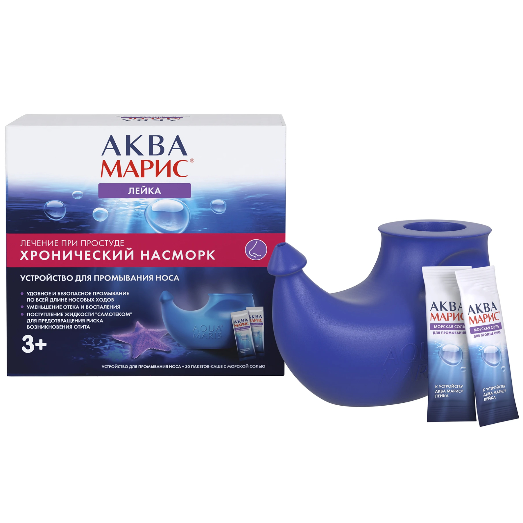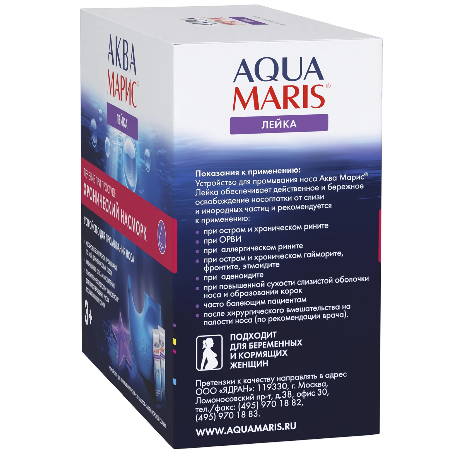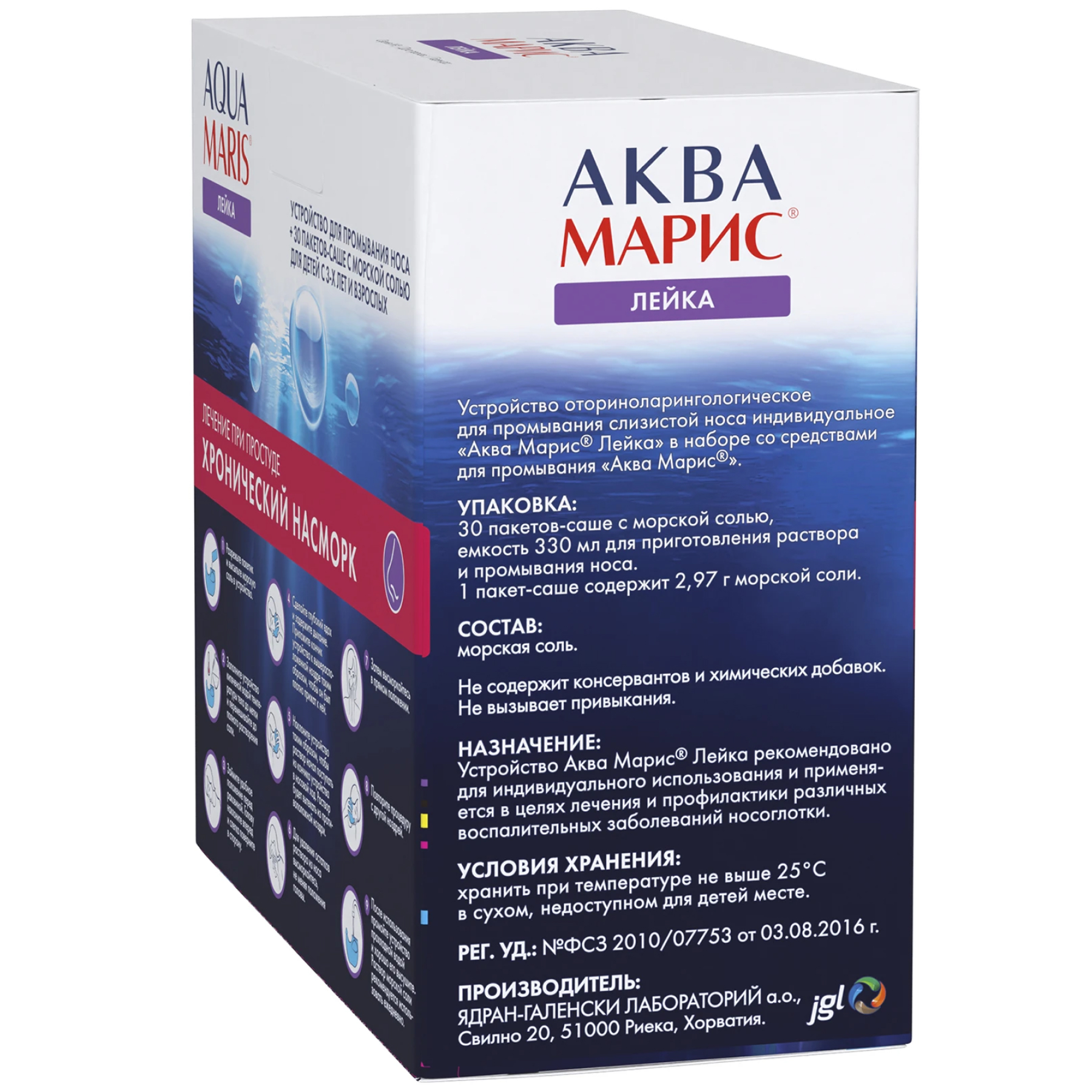 Устройство Аква Марис® Лейка представляет собой пластиковую емкость объемом 330 мл для приготовления раствора для промывания носа в наборе со средством для промывания Аква Марис® в виде 30 пакетов-саше с солью Адриатического моря. 1 пакет-саше содержит 2,97 г морской соли.