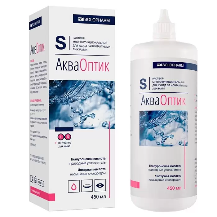 Раствор многофункциональный для ухода за контактными линзами АкваОптик (далее - раствор) представляет собой прозрачный или слегка опалесцирующий бесцветный раствор.