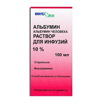Плазмозамещающее средство, получаемое путем фракционирования плазмы, сыворотки от здоровых доноров. Восполняет дефицит альбумина плазмы крови, поддерживает коллоидно-осмотическое (онкотическое) давление крови, быстро повышает артериальное давление и ОЦК, способствует переходу жидкости из тканей в кровеносное русло, обладает дезинтоксикационными свойствами. Альбумин - природный белок, являющийся составной частью белковой фракции крови человека, с молекулярной массой 69000 дальтон. В норме в плазме человеческой крови альбумин составляет примерно 60 %. В состав белковой молекулы альбумина входят все 20 аминокислот. Синтез альбумина происходит в печени. Альбумин в организме выполняет ряд функций. Основная его функция - поддержание коллоидно-онкотического давления крови. Раствор альбумина 100 мг/мл является эффективным средством коррекции гипоальбуминемии различного генеза, нарушенной центральной и периферической гемодинамики, водно-электролитного равновесия, обладает дезинтоксикационными свойствами. Альбумин связывает и транспортирует внутрь организма пигменты (билирубин), жирные кислоты, ионы некоторых металлов, лекарственные вещества. Кроме того, альбумин связывает токсины и инактивирует их.