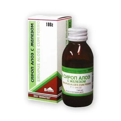 Активные вещества: железа (II) хлорид раствор свежеприготовленный с массовой долей железа(II)-иона 14,8% – 13,5 г; алоэ сок – 29,6 г.