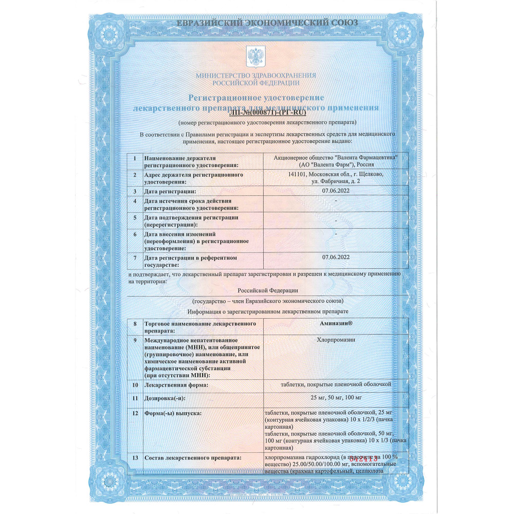 Таблетки Аминазин® назначают внутрь (после еды), не разжевывая, запивая достаточным количеством воды.