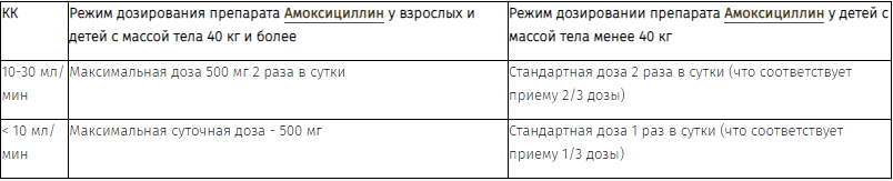 Общий сывороточный клиренс амоксициллина увеличивается пропорционально снижению функции почек. При нарушении функции почек (КК < 15 мл/мин) Т1/2 удлиняется и может достигать при анурии 8,5 часов.