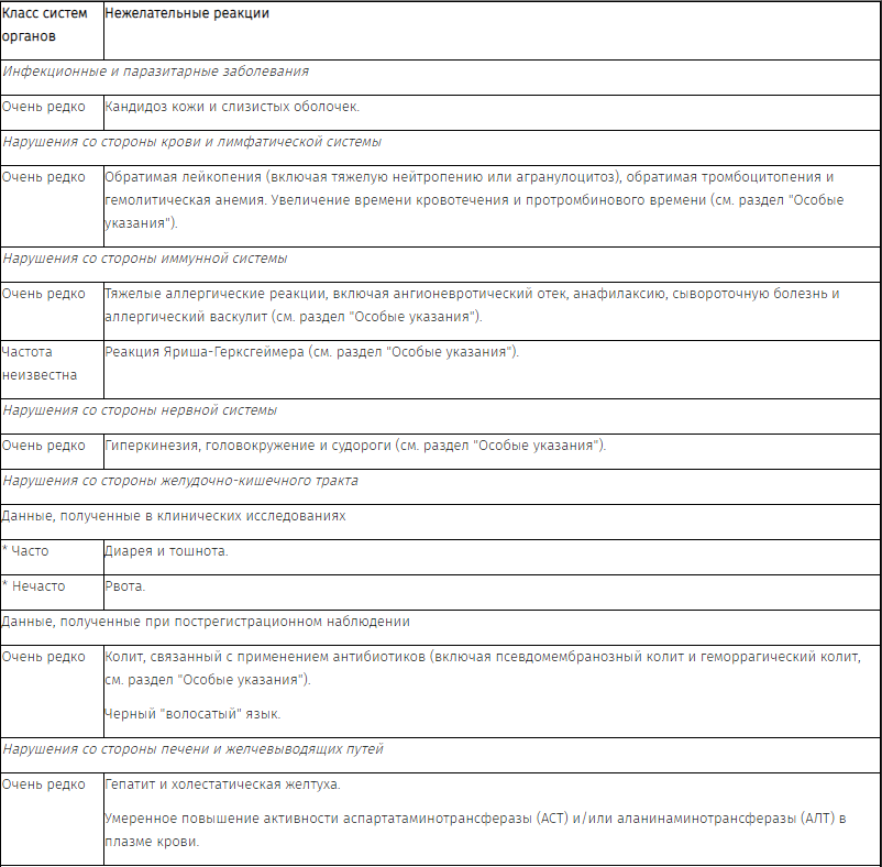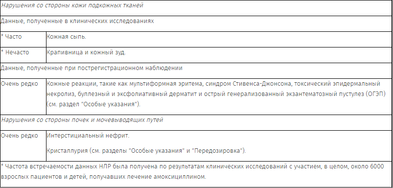 НЛР, зарегистрированные в клинических исследованиях и при пострегистрационном применении амоксициллина, представлены ниже по классам систем органов MedDRA.