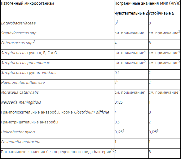 1 Дикий тип энтеробактерий классифицирован как восприимчивый к аминопенициллину. В некоторых странах предпочтение отдаётся отдельной классификации диких типов штаммов E.coli и P.mirabilis как промежуточных продуктов. В этом случае следует использовать пограничное значение МИК S<0,5 мг/л.