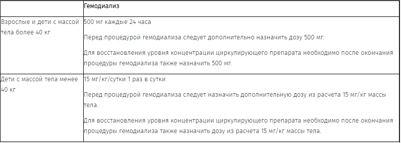 У пациентов с КК >30 мл/мин отсутствует необходимость в коррекции дозы. При КК < 30 мл/мин рекомендуется увеличение интервала между дозами или уменьшение последующих доз.