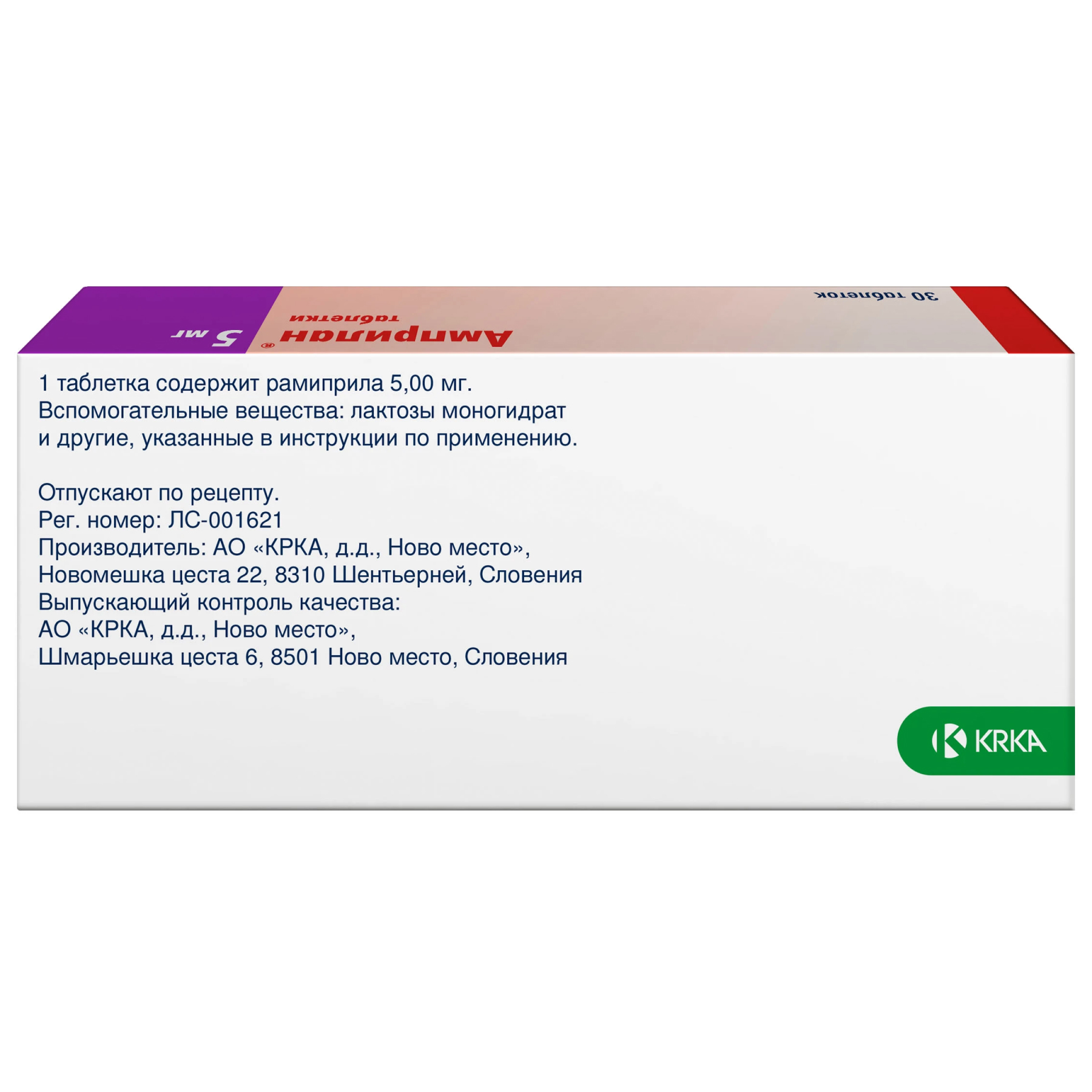 T1/2 для рамиприла - 5.1 ч; в фазе распределения и элиминации падение концентрации рамиприлата в сыворотке крови происходит с T1/2 - 3 ч, затем следует переходная фаза с T1/2 - 15 ч, и длительная конечная фаза с очень низкими концентрациями рамиприлата в плазме и T1/2 - 4-5 дней. T1/2 увеличивается при хронической почечной недостаточности. Vd рамиприла - 90 л, рамиприлата - 500 л. Почками выводится 60%, через кишечник - 40% (преимущественно в виде метаболитов). При нарушении функции почек выведение рамиприла и его метаболитов замедляется пропорционально снижению КК; при нарушении функции печени замедляется превращение в рамиприлат; при сердечной недостаточности концентрация рамиприлата повышается в 1.5-1.8 раза.