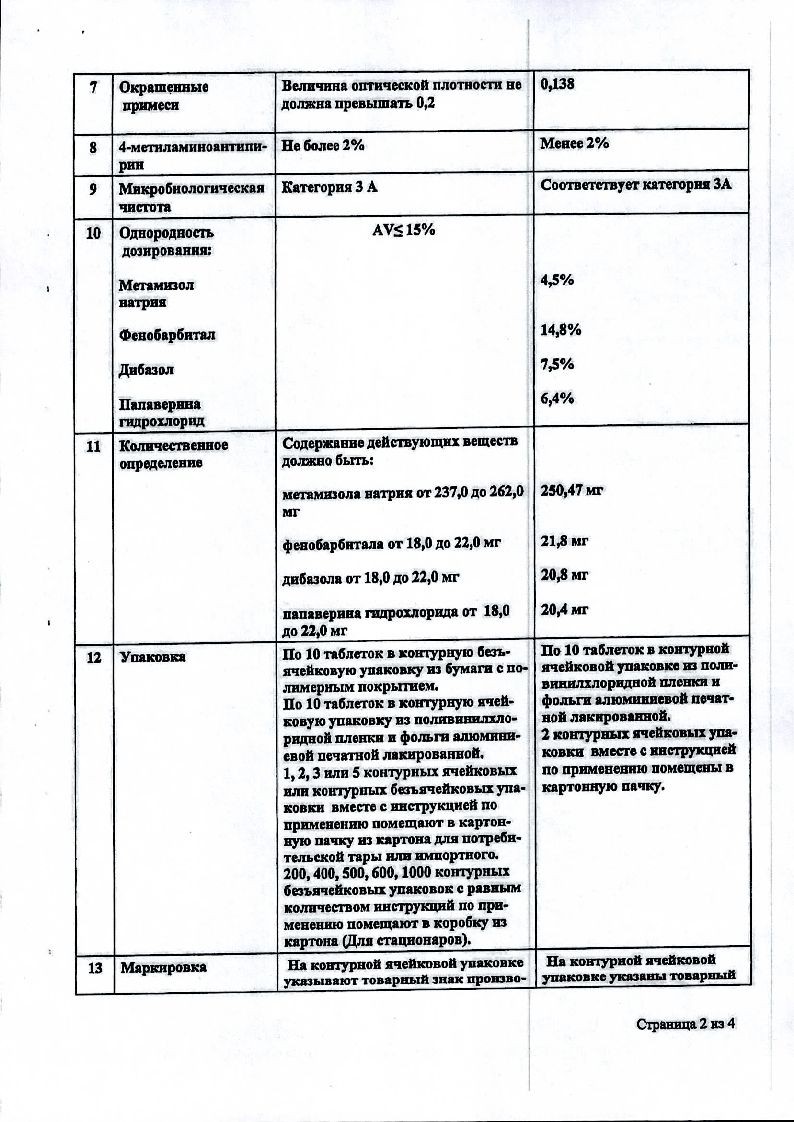 Активные вещества: метамизол натрия (анальгин) 250 мг, фенобарбитал 20 мг, бендазол 20 мг, папаверина гидрохлорид 20 мг.