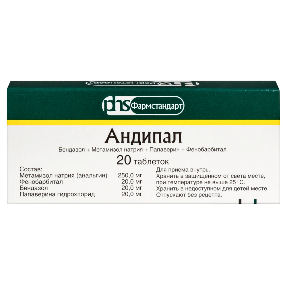 Активные вещества: метамизол натрия (анальгин) 250 мг, фенобарбитал 20 мг, бендазол 20 мг, папаверина гидрохлорид 20 мг.