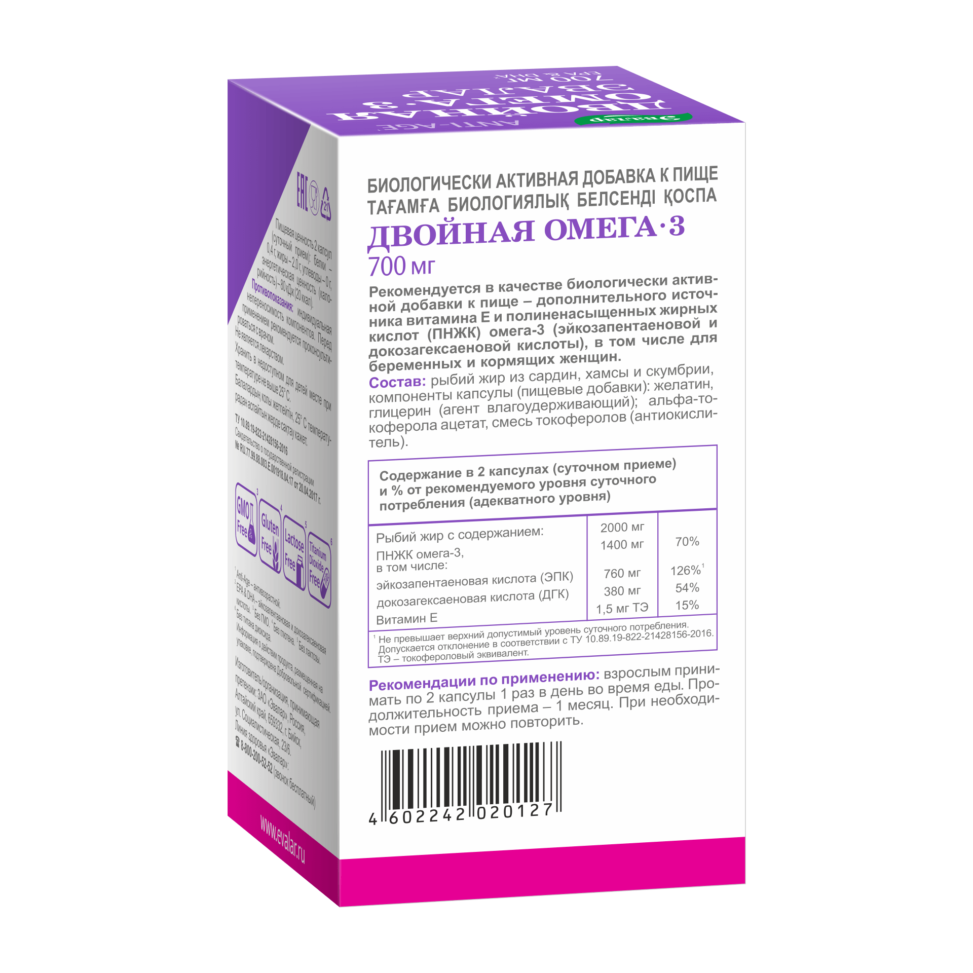 рыбий жир из сардин, хамсы и скумбрии – 700 мг, капсула: желатин, глицерин (агент влагоудерживающий); альфа токоферола ацетат, смесь токоферолов (антиокислитель).