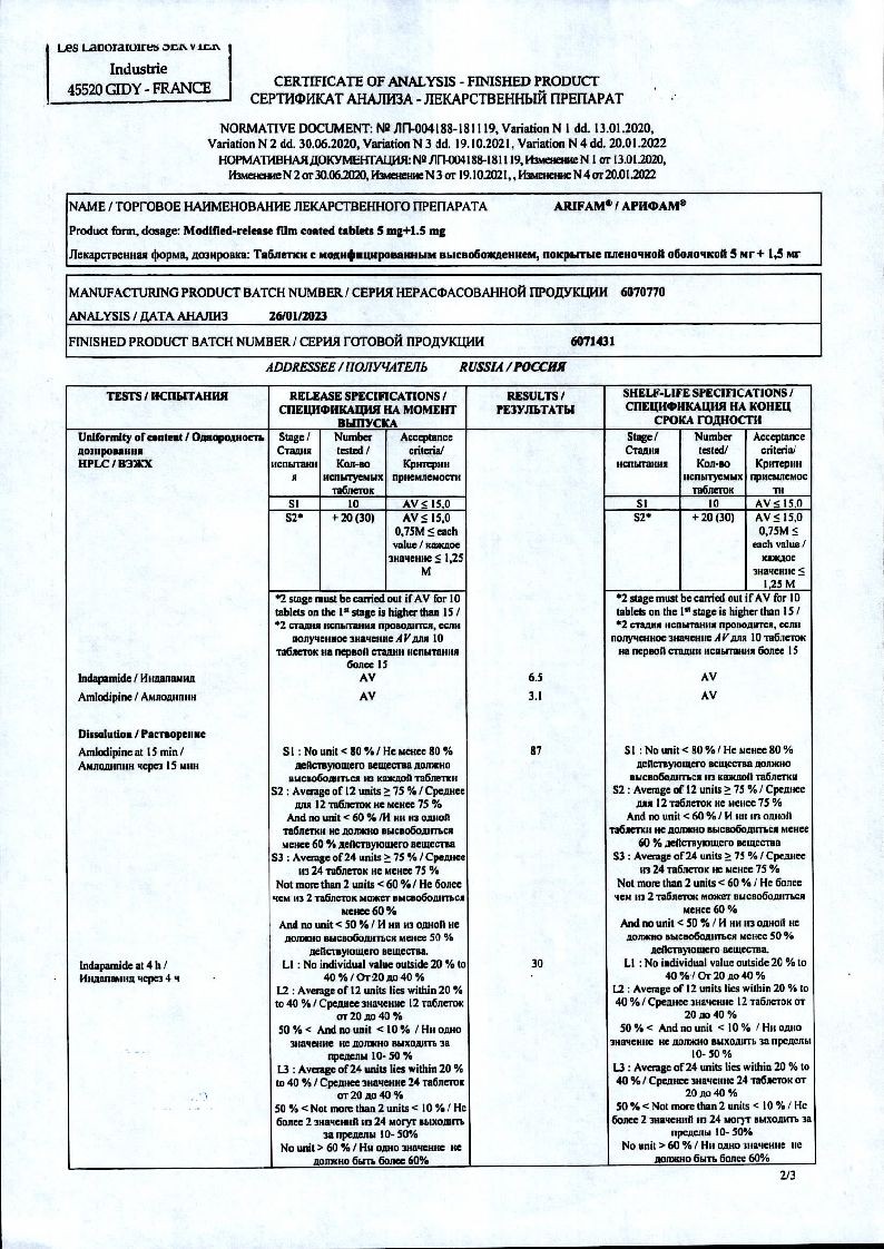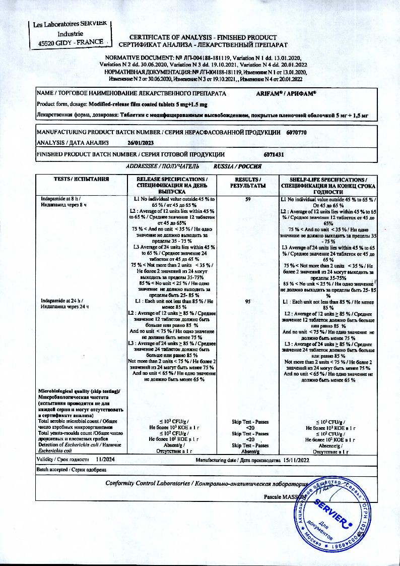 Индапамид 1.5 мг в препарате Арифам® модифицированного высвобождения, распределен в специальном матриксе-носителе, что позволяет постепенно высвобождать индапамид.