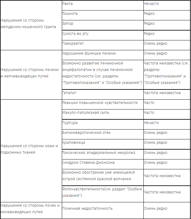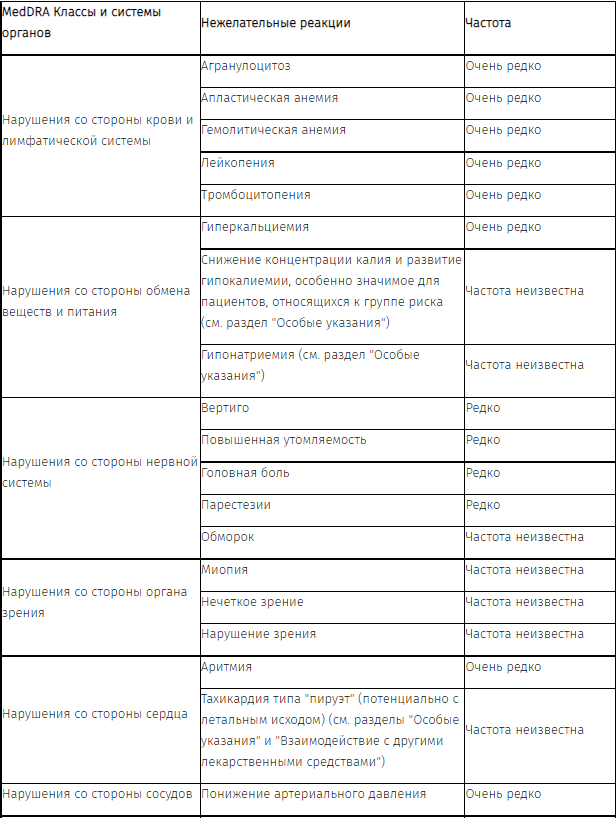 Частота побочных реакций, которые были отмечены во время терапии индапамидом приведена в виде следующей градации: очень часто (≥1/10); часто (≥1/100, <1/10); нечасто (≥1/1000, <1/100); редко (≥1/10000, <1/1000); очень редко(<1 /10000); неуточненной частоты (частота не может быть подсчитана по доступным данным).