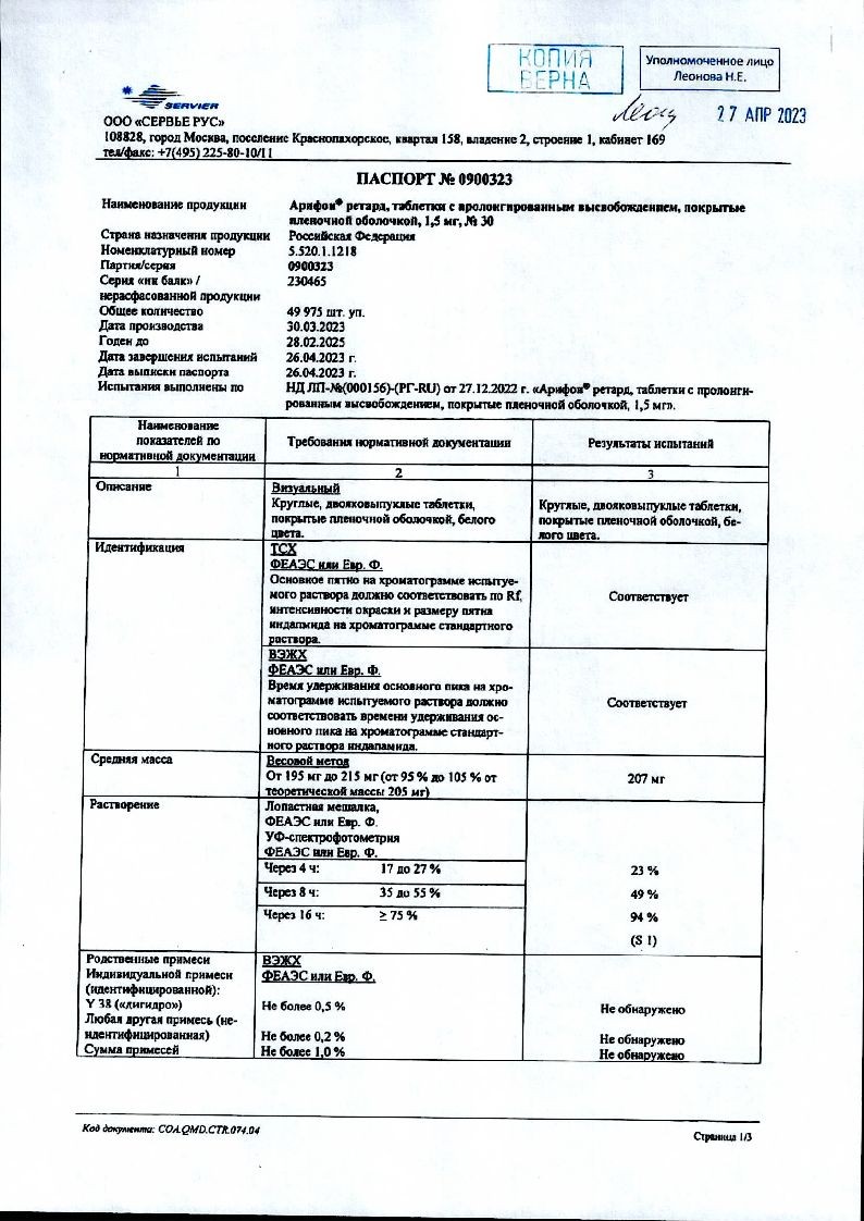 Арифон® ретард в дозе 1,5 мг/сутки (1 таблетка) можно назначать пожилым пациентам с нормальной или незначительно нарушенной функцией почек (см. "Противопоказания").