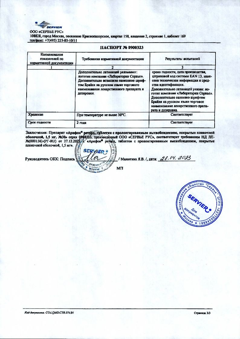 Активное вещество, входящее в состав препарата Арифон® ретард, может давать положительный результат при проведении допинг-контроля у спортсменов.