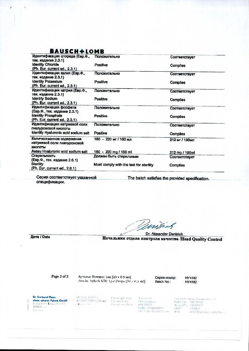 Артелак® Всплеск Уно содержит гиалуроновую кислоту (натрия гиалуронат), которая является природным увлажняющим веществом с высокой способностью связываться с водой. Гиалуроновая кислота входит в состав естественной слезной пленки здорового глаза человека.