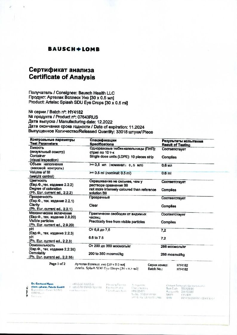 Артелак® Всплеск Уно не содержит консервант, поэтому каждая упаковка для однократного применения может использоваться только один раз.