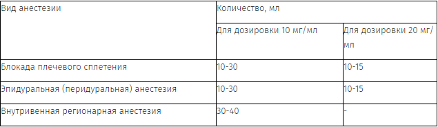 Рекомендуемая максимальная доза для взрослых: 5-6 мг/кг массы тела (не более 400 мг). Ниже представлены ориентировочные дозы, которые необходимо корректировать в зависимости от глубины анестезии и состояния пациента.