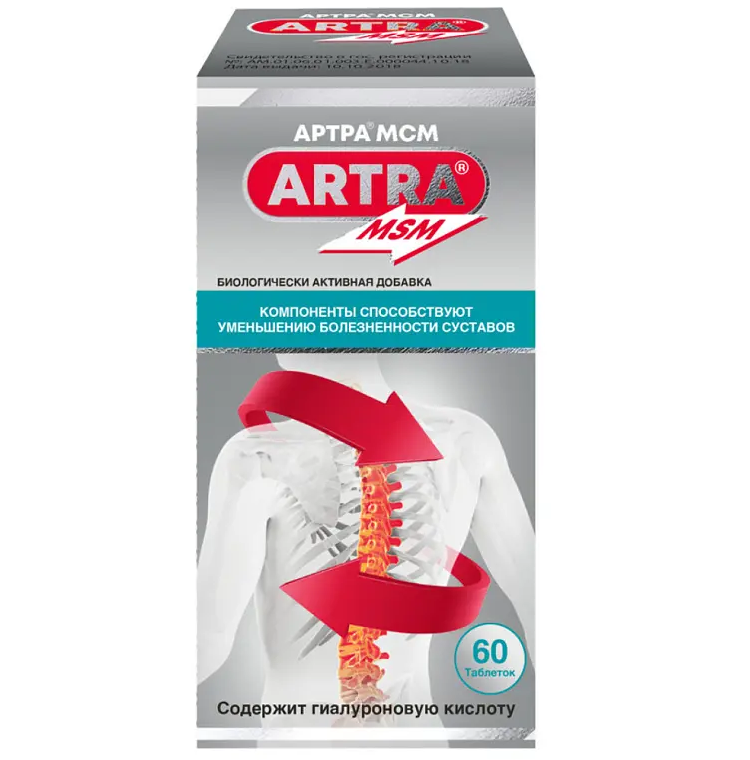 Биологически активная добавка к пище. Артра® МСМ содержит высокие концентрации глюкозамина, хондроитина, гиалуроновой кислоты и метилсуфонилметана (МСМ), которые в комбинации проявляют синергизм, дополняя и усиливая эффекты друг друга.