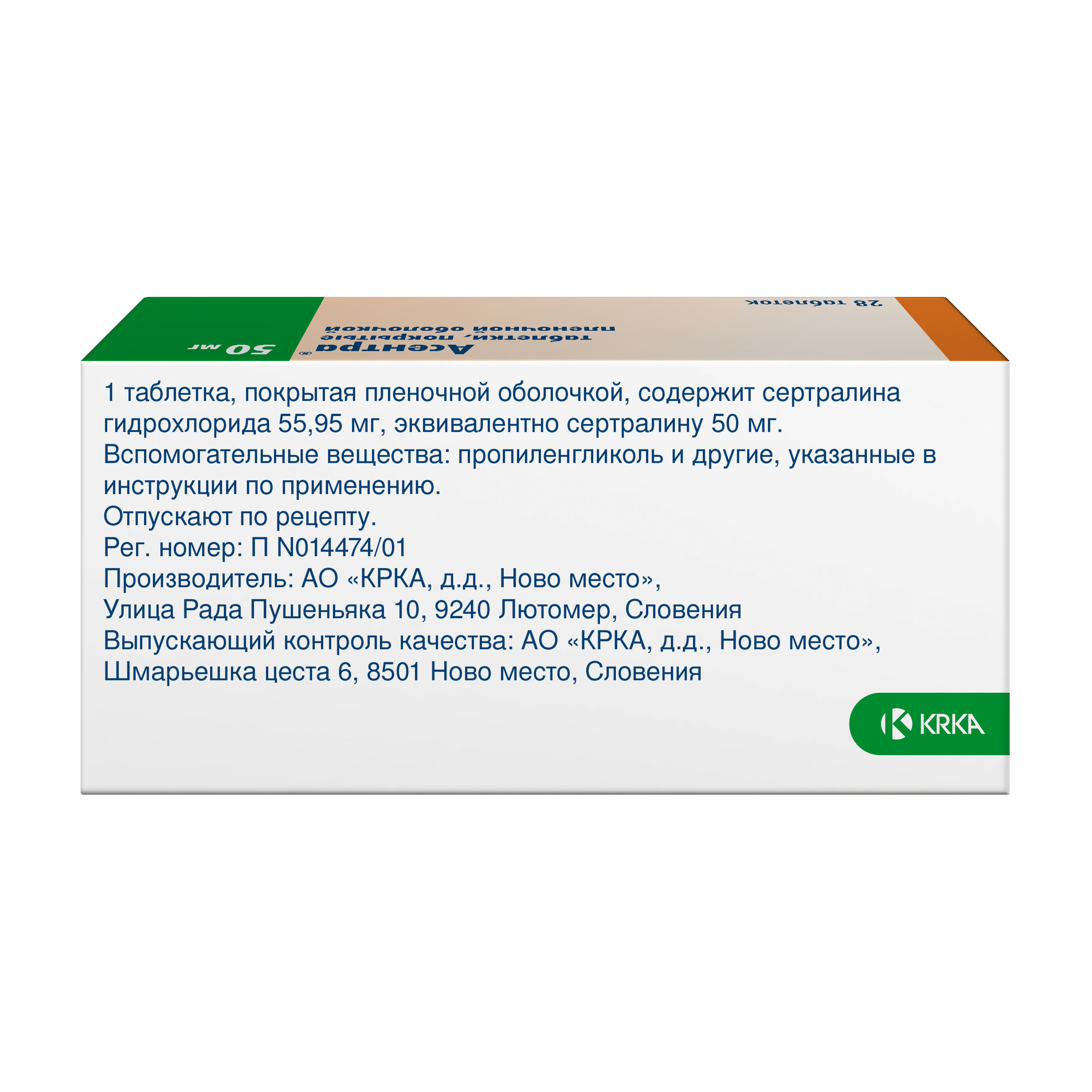 Активное вещество: сертралина гидрохлорид 55.95 мг, что соответствует содержанию сертралина 50 мг.