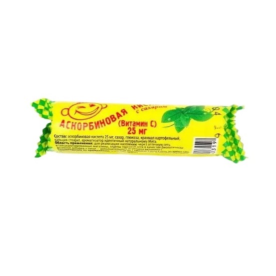 Аскорбиновая кислота, сахар, глюкоза, картофельный крахмал, стеарат кальция, ароматизаторы натуральные или идентичные натуральным.