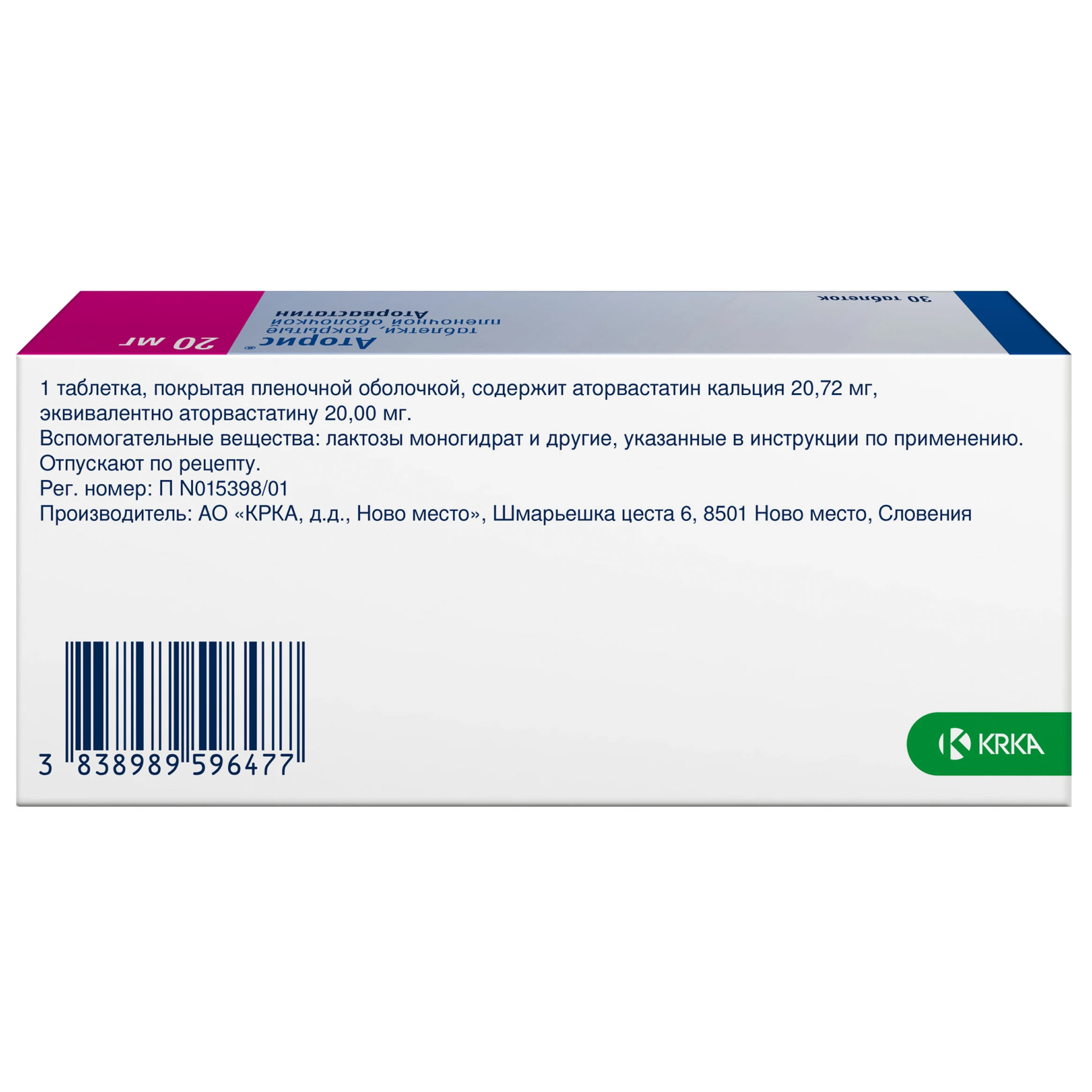 Действующее вещество: аторвастатин кальция 20,72 мг (эквивалентно аторвастатину 20,00 мг)
