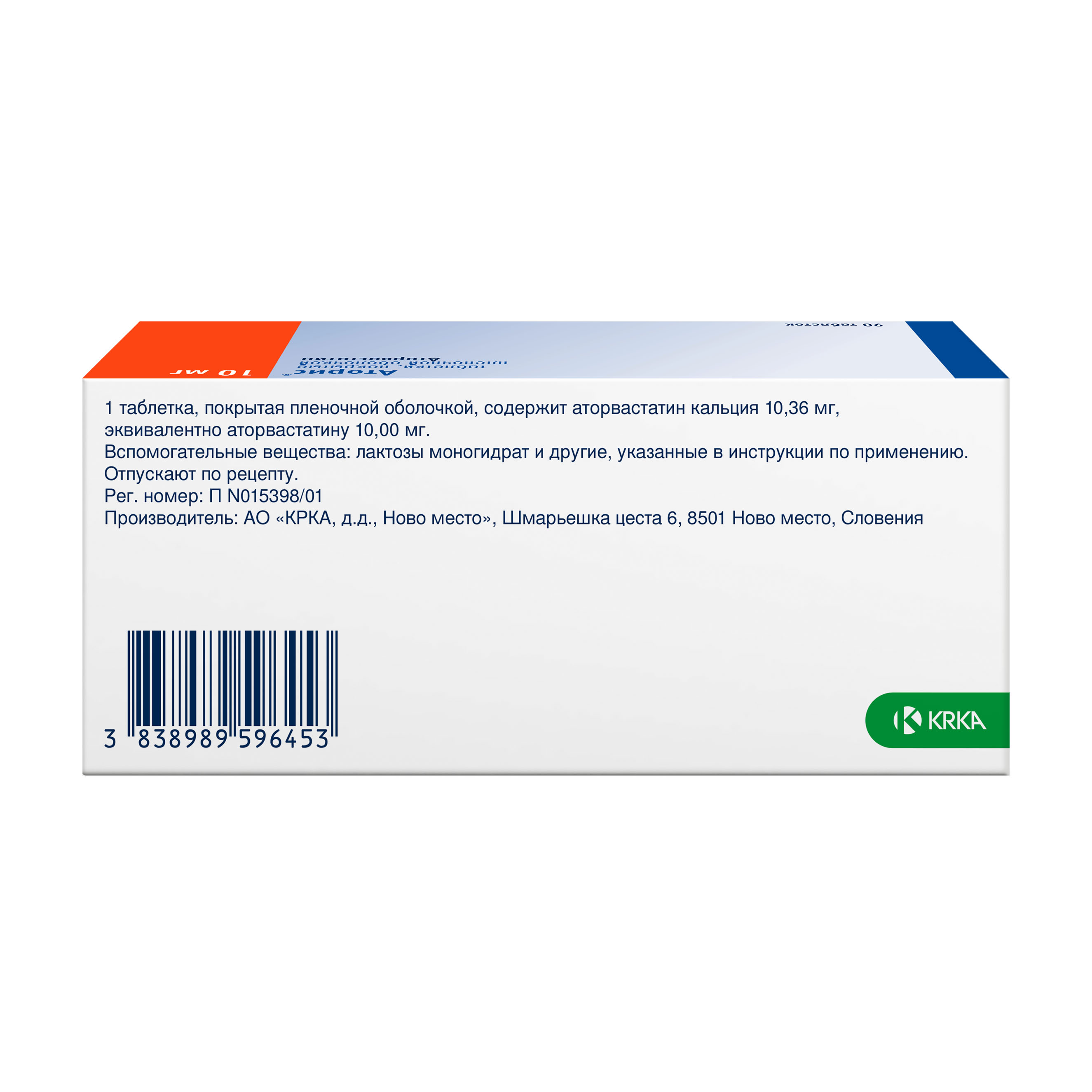 Действующее вещество: аторвастатин кальция 10.36 мг, эквивалентно аторвастатину 10 мг.