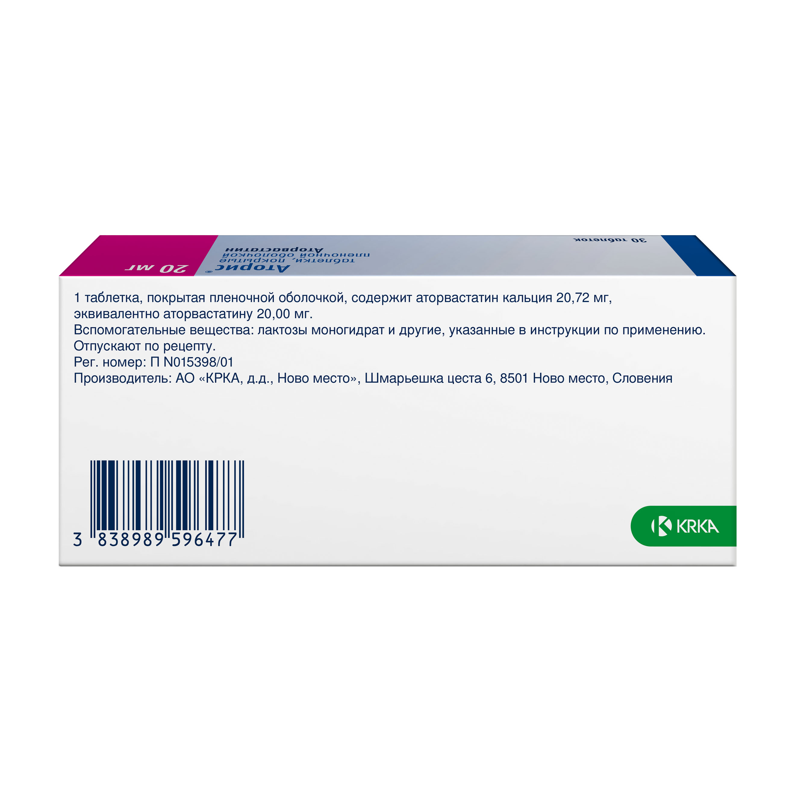 Действующее вещество: аторвастатин кальция 20,72 мг (эквивалентно аторвастатину 20,00 мг)