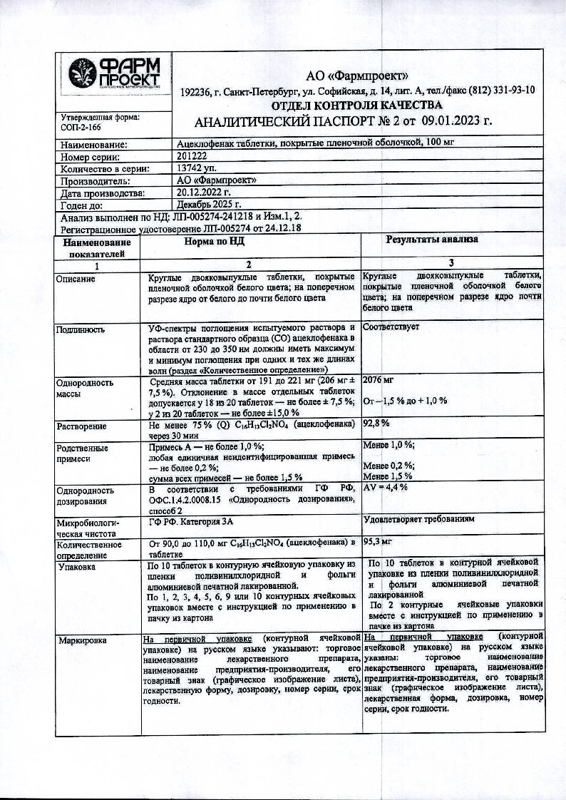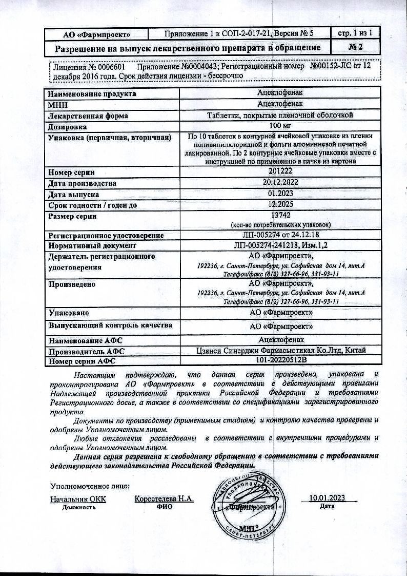 Действующее вещество: ацеклофенак - 100,0 мг.